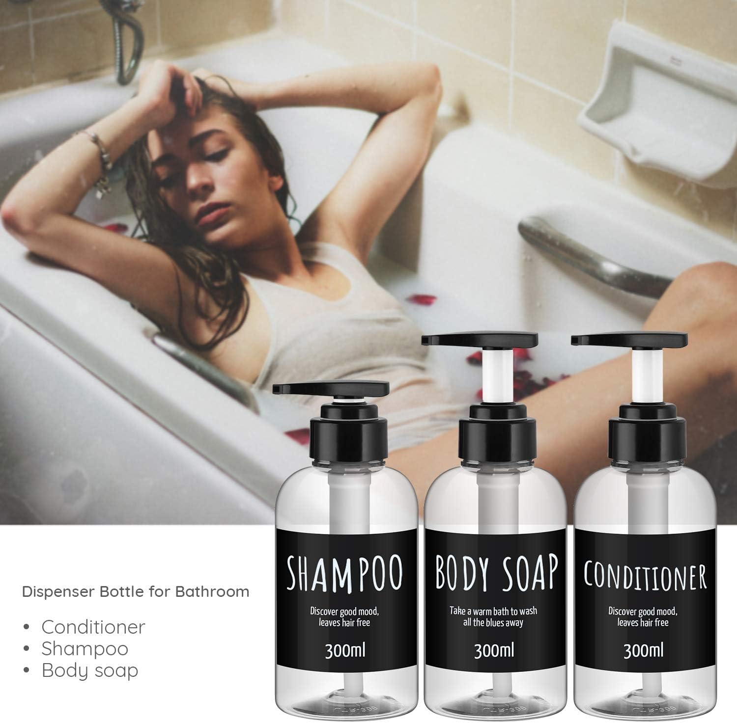 - 【Simple Look】 Its elegant look can update your bathroom. Set of 3 packs dispenser bottle, each holds 10.1oz large capacity to meet the whole family's essential needs. 3 pre-labeled waterproof label bottles, shampoo, body soap and conditioner, enable you to identify your bottle. It could clean up the shower look and help organize your bathroom essentials.