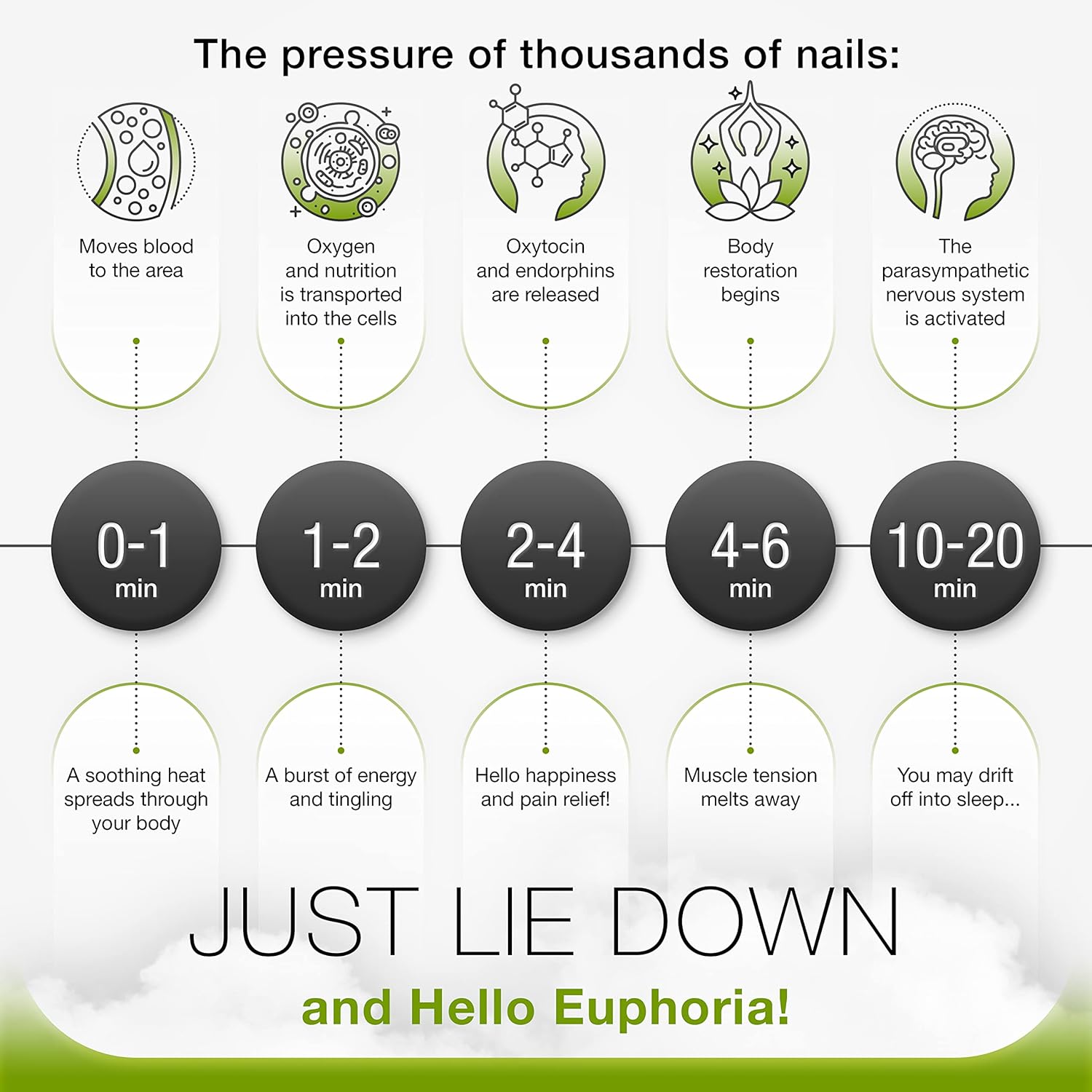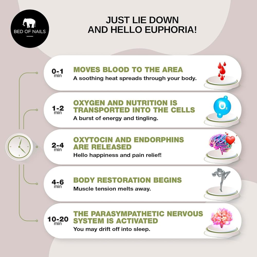- BED OF NAILS BENEFITS: Our acupuncture mat does not penetrate the skin, but instead supports relaxation, meditation, deep sleep, stress, muscle tension, upper and lower back pain, plantar fasciitis, and more, as the body restores natural vitality, making this a great addition to your beauty tools arsenal