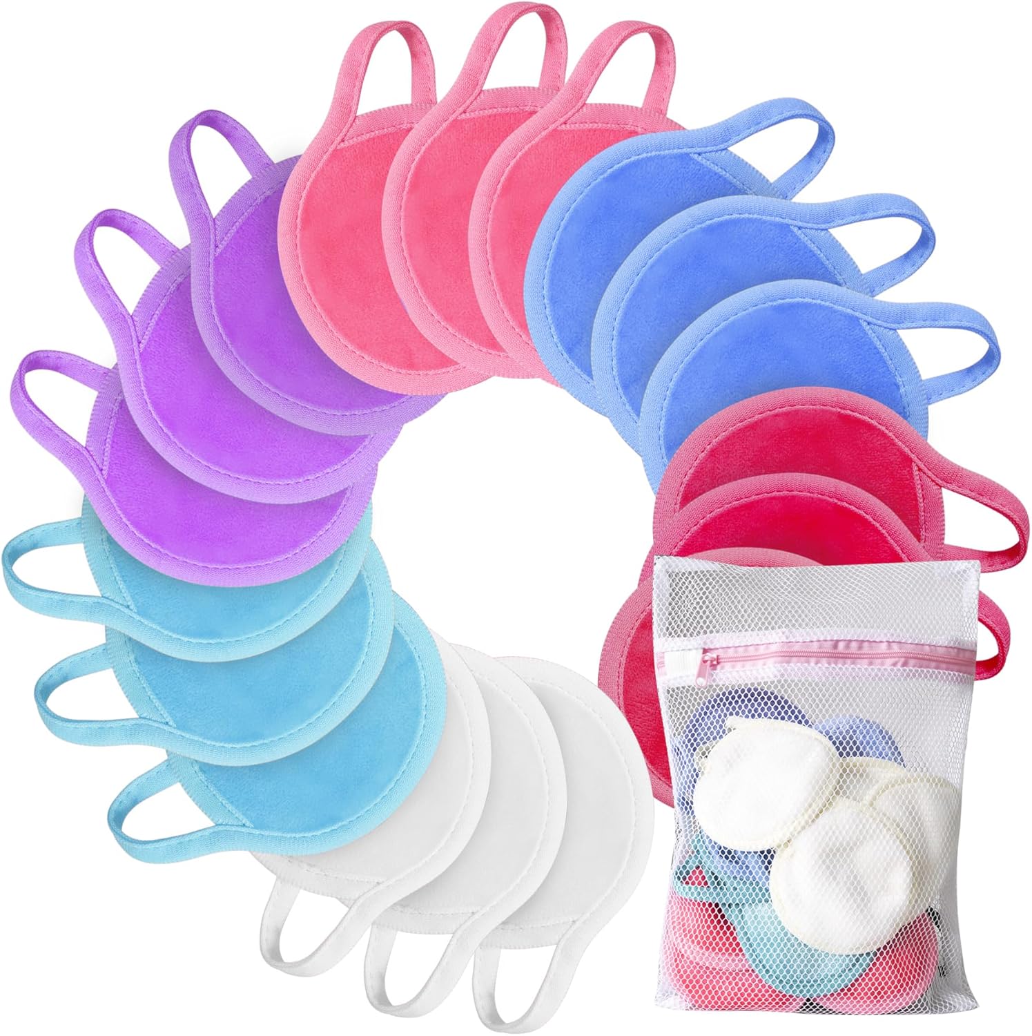 - Package Included: Comes with 18 packs of 6 mixed colour reusable round facial pads and one piece of washable mesh laundry bag. Each pad measures 3.74 x 3.74 inches. Each has a handy hanging loop for easy storage and quick drying. Perfect for daily use or travel