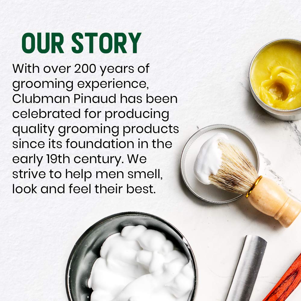 - MADE IN THE US, CRUELTY-FREE, TRUSTED FOR GENERATIONS: With over 200 years of grooming experience, Clubman Pinaud is a trusted brand. Clubman has been celebrated for producing quality products since its foundation in the early 1800s. Men have been using their products for generations, while younger users are turning to their products for trusted grooming solutions with a sense of nostalgia, proving quality never goes out of style. Completely cruelty-free, proudly made in the USA.
