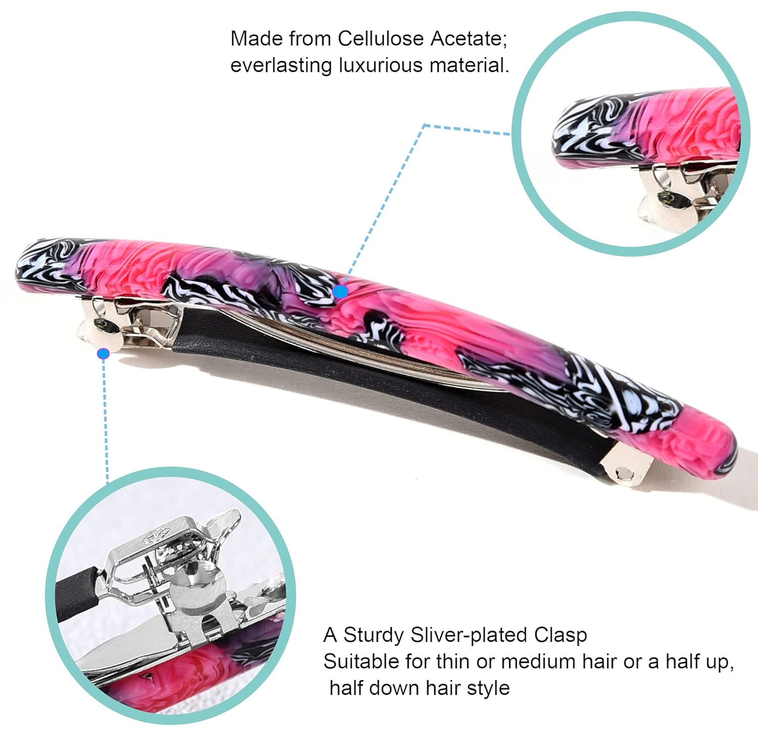 - Premium Quality Material: These hair barrettes are crafted from luxurious, high-grade cellulose acetate, offering an elegant and timeless design. The silver-plated metal automatic clasps ensure durability and comfort without pulling your hair. Perfect for everyday wear, these tortoise barrettes add a charming touch to any hairstyle.