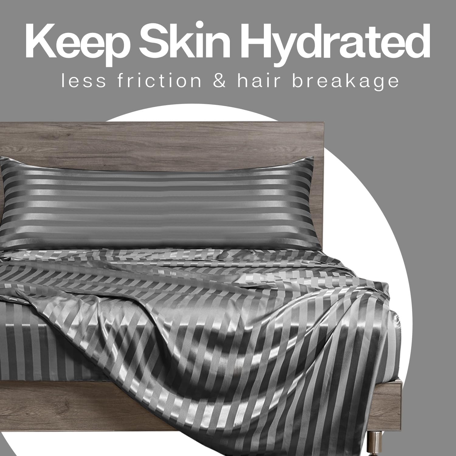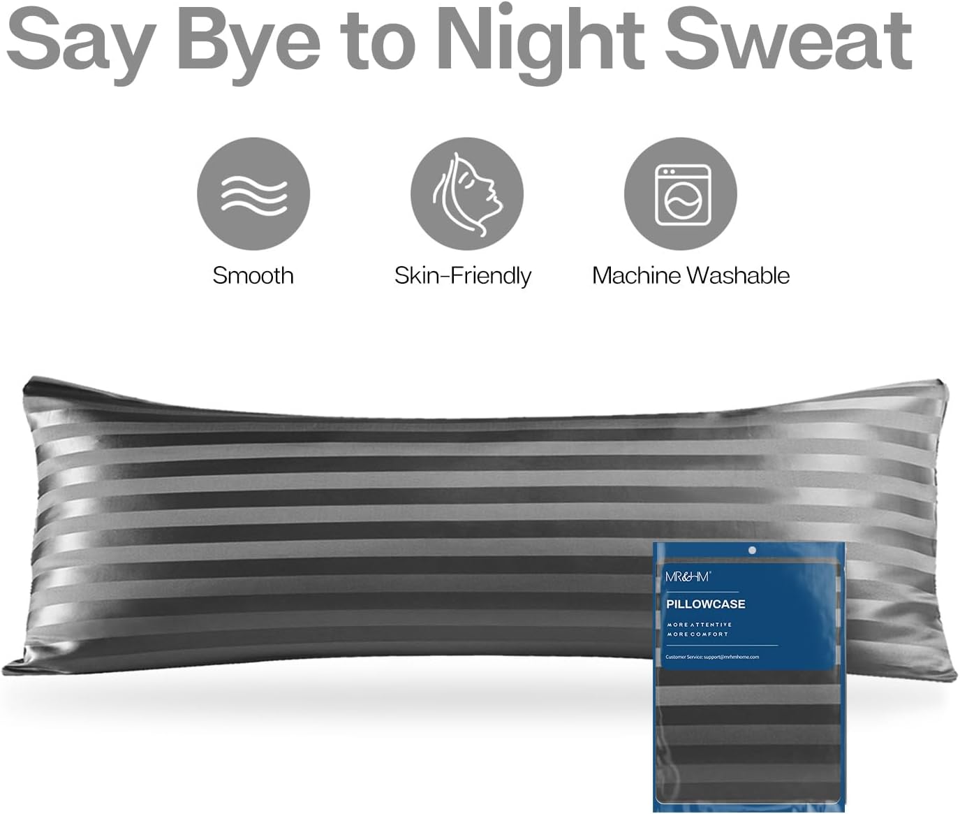 MR&HM Satin Body Pillow Cover, Soft and Breathable Body Pillow Case with Envelope Closure, Cooling and Silky Long Pillowcase for Hair and Skin,Grey (20x54, Dark Grey Striped)