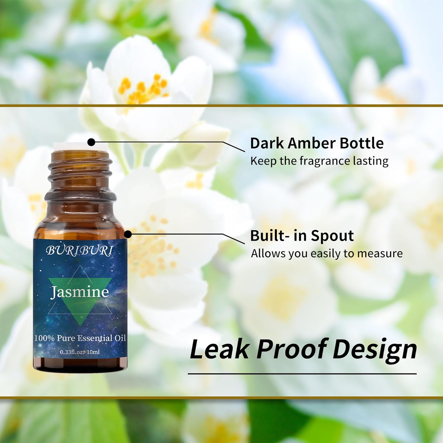 - Packing Includes: 10ml Rose Essential Oil x1, 10ml Jasmine Essential Oil x1. With no adulterants or dilution, 100% pure quality. BURIBURI scented oil is bottled in a durable amber glass bottle.