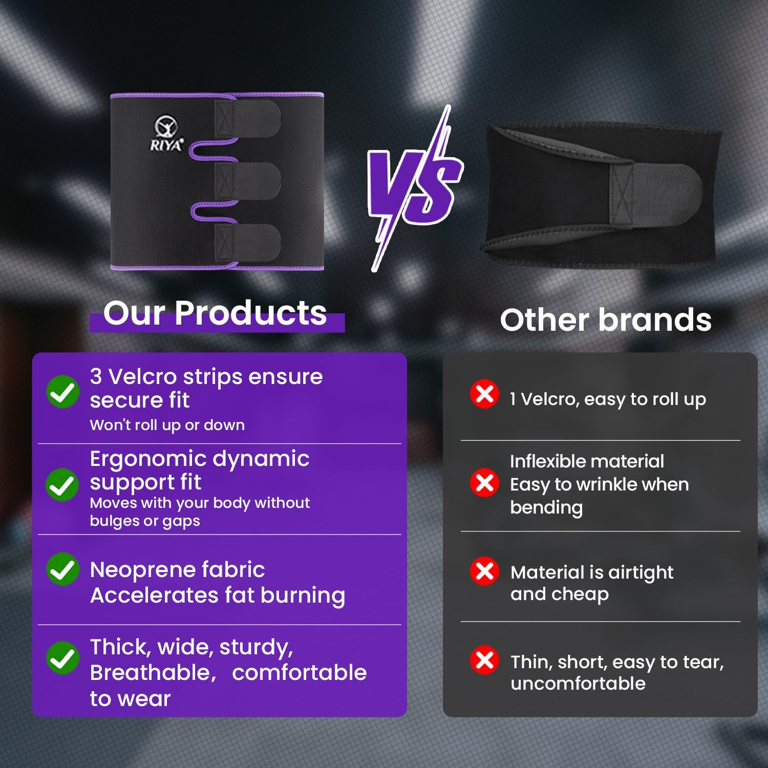 - Custom Fit for All Body Shape - The upgraded RIYA waist trimmer features triple adjustable Velcro straps for a secure, customized fit that stays perfectly in place, with no rolling, slipping, or riding up no matter how intense your workout. If you prefer full belly coverage and a tighter wrap â PLEASE SIZE UP FOR BEST RESULTS.