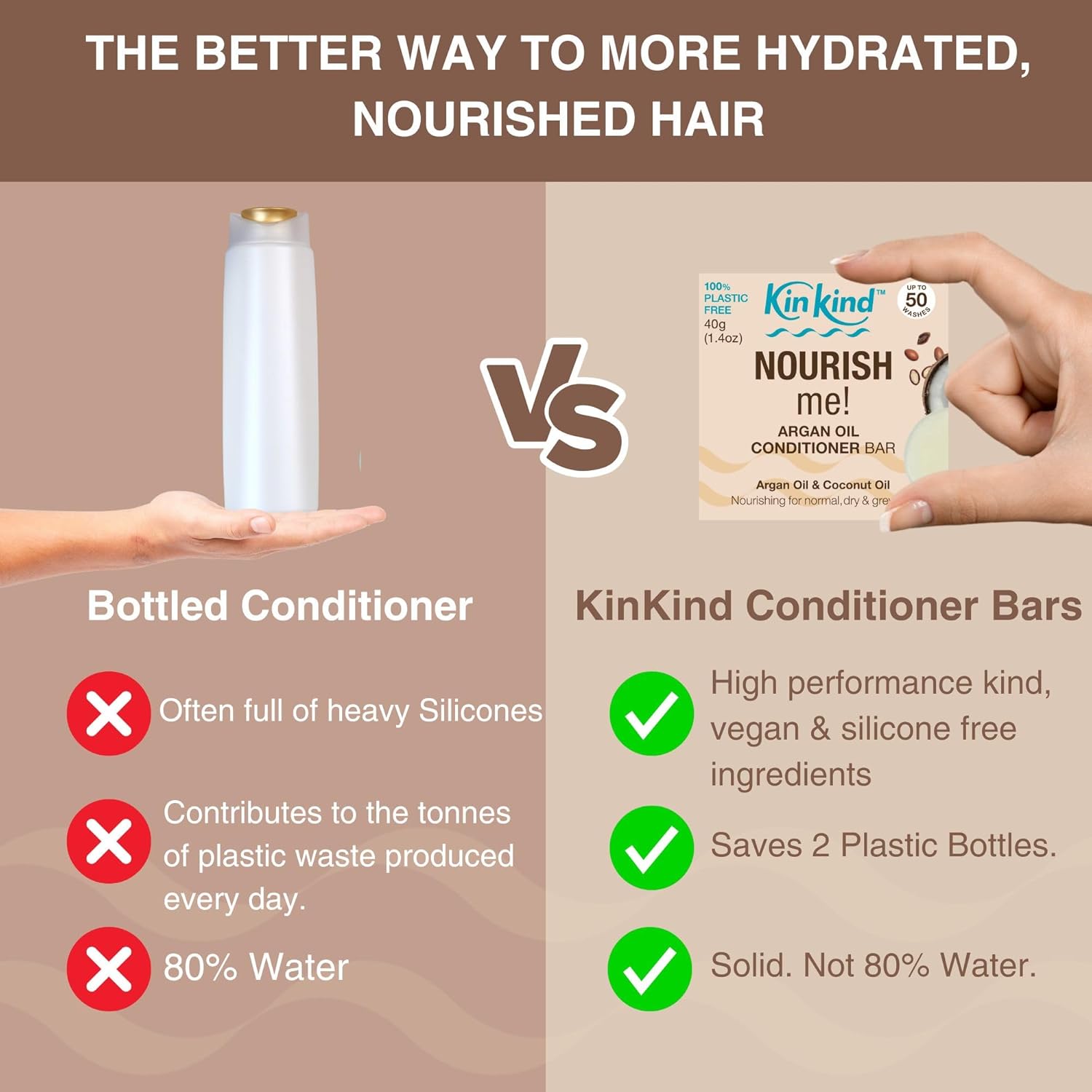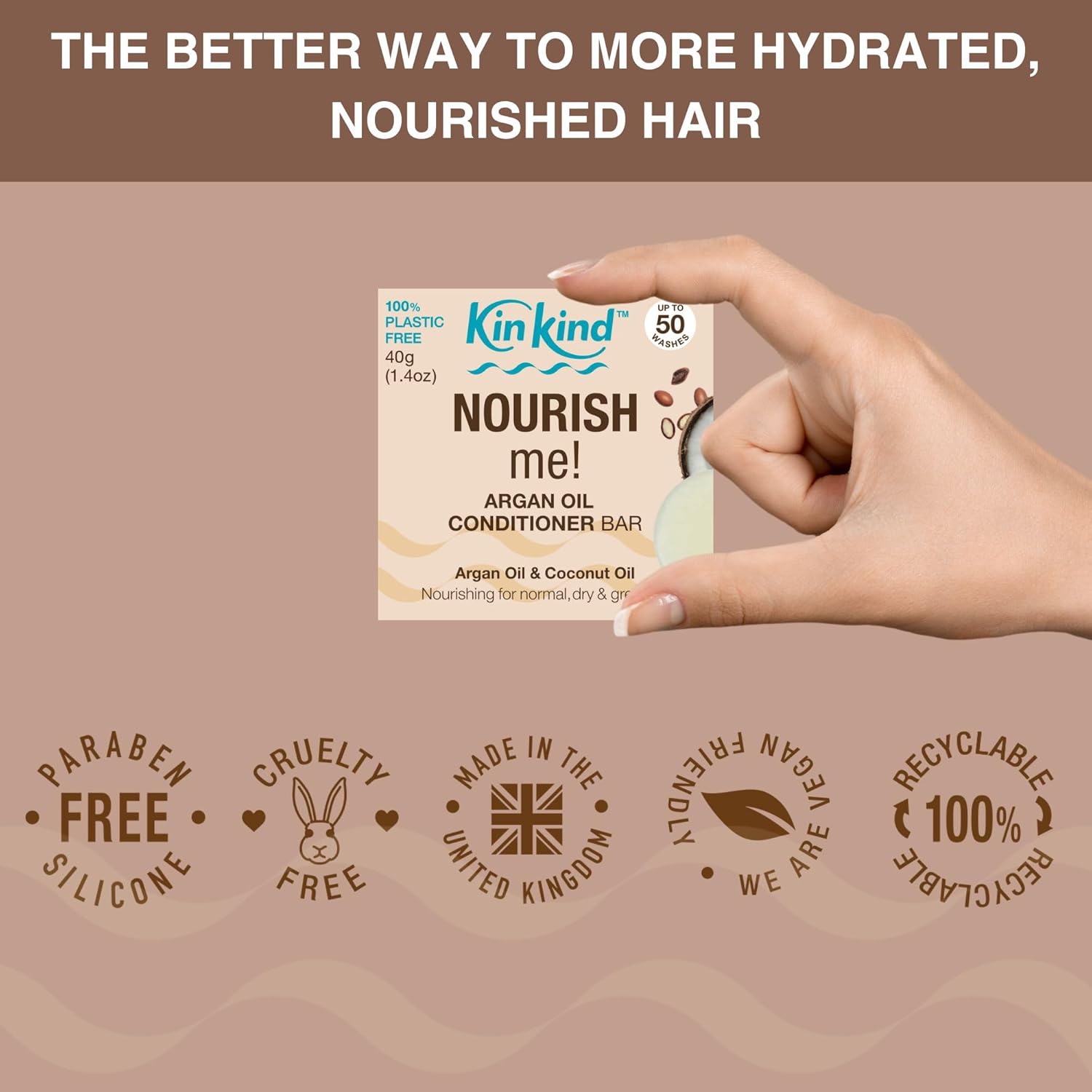 - EXTRA HYDRATING & NOURISHING : NOURISH me! is KinKind's Conditioner bar formulated for normal to dry hair, and grey hair. Rich, creamy, packed with Argan Oil & Coconut Oil for extra hydration and nourishment.