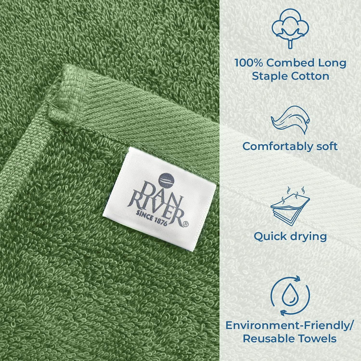 DAN RIVER Bath Towels Set of 4, 27 x 54 Inches, 100% Cotton, Larger & Lighter Weight, Quicker to Dry, Super Soft and Absorbent, Ideal Large Bath Towel for Daily Use, Sage Green