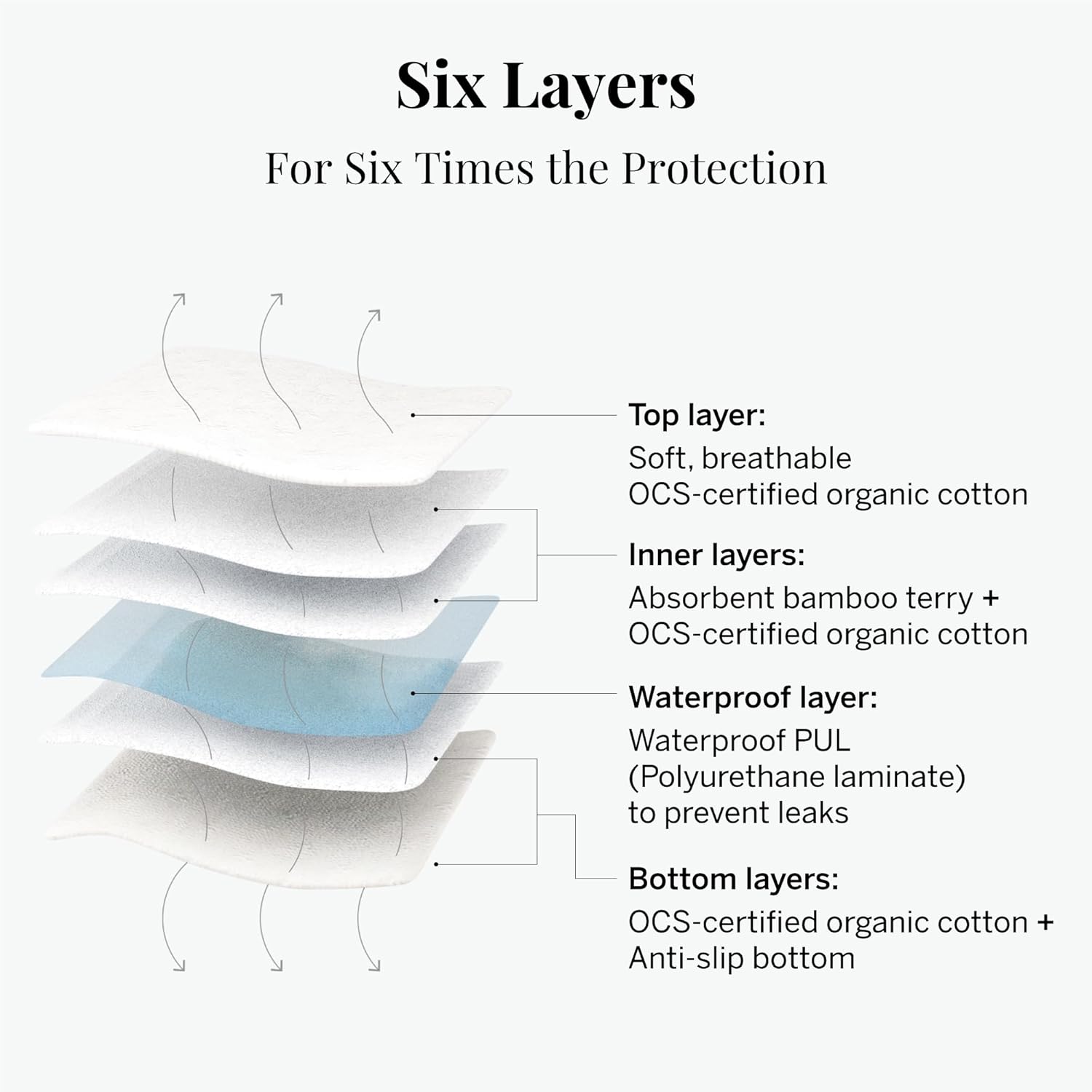 - SAFE + ORGANIC - Top layer is made with OCS certified organic cotton without the use of toxins, chlorine, pesticides, and fragrance so nothing harmful is touching your skin. No dyes, no bleach, no chemicals, ever.