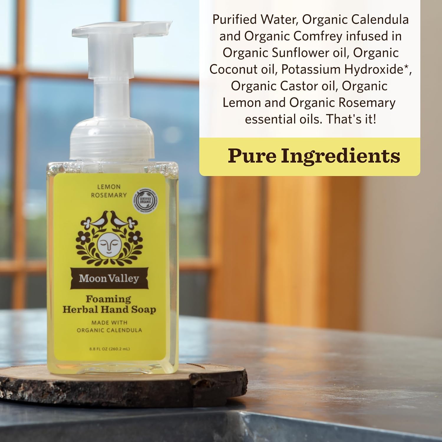- TWO-PACK: This bundle of two 8.8oz Foaming Hand Soaps includes fresh and natural scents of Lemon Rosemary. Moon Valley Organics Herbal Foaming Hand Soaps are certified organic, vegan and non-gmo. Each bottle is recyclable. Ingredients leave hands soft and moisturized.