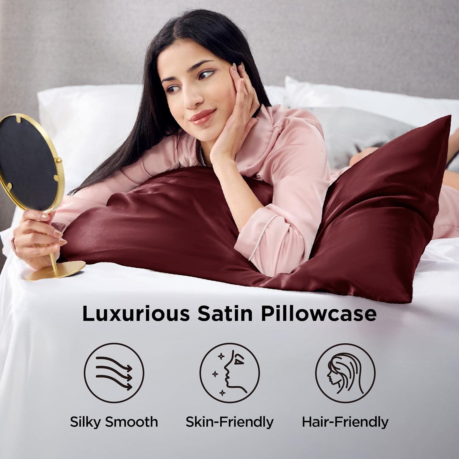 Bedsure King Size Satin Pillowcase Set of 2 - Christmas Pillow Cases for Hair and Skin with Envelope Closure, Similar to Silk Pillow Cases, Gifts for Women Men, Burgundy, 20x36 Inches, 2pcs