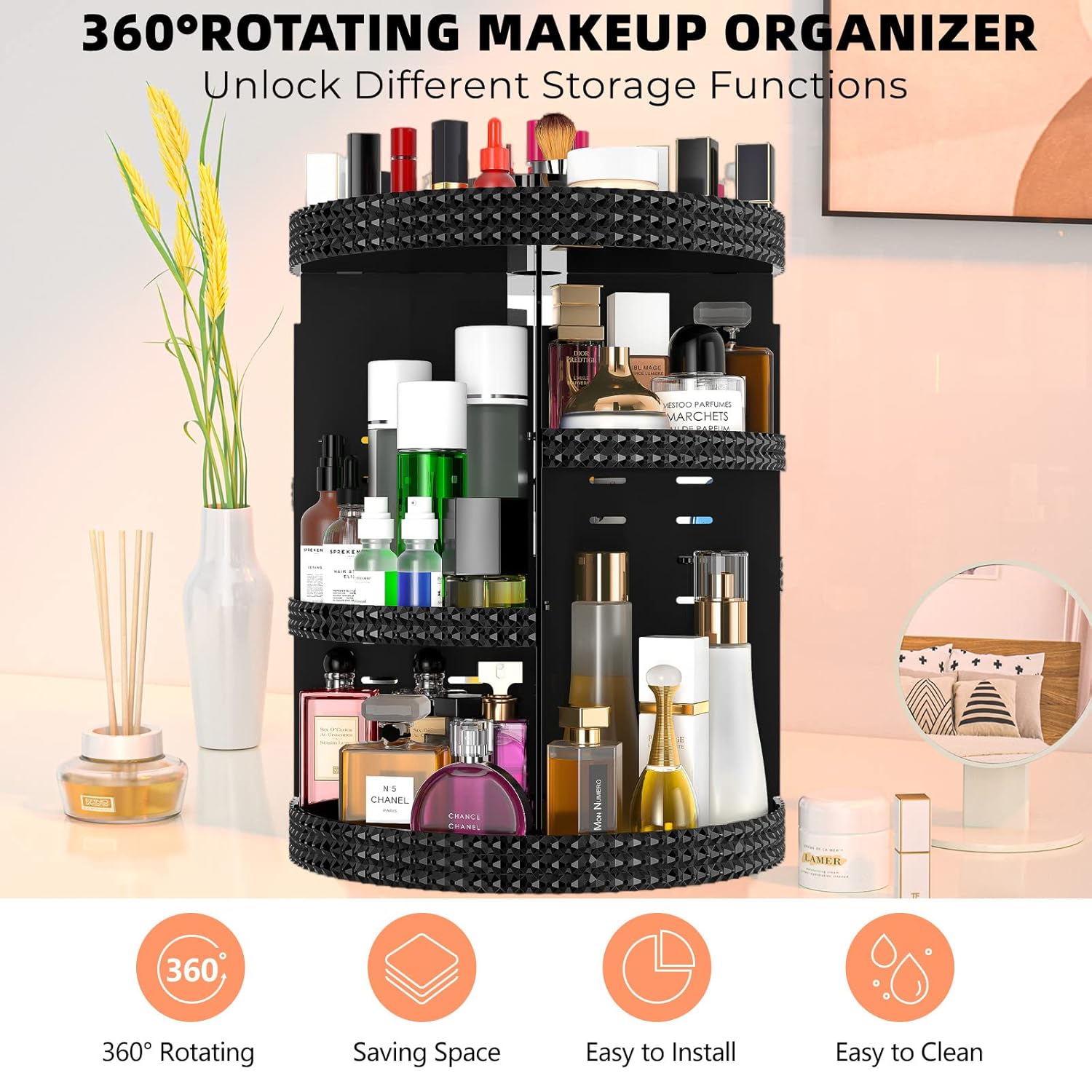 - Specific Uses For Product : Makeup organizer, 360 rotating makeup organizer, cosmetic storage, organizer of perfumes, nail polish, lipstick, makeup brush, hand cream, mascara, concealer, toner, sunscreen Makeup organizer, 360 rotating makeup organizer, cosmetic storage, organizer of perfumes, nail polish, lipstick, makeup brush, hand cream, mascara, concealer, toner, sunscreen