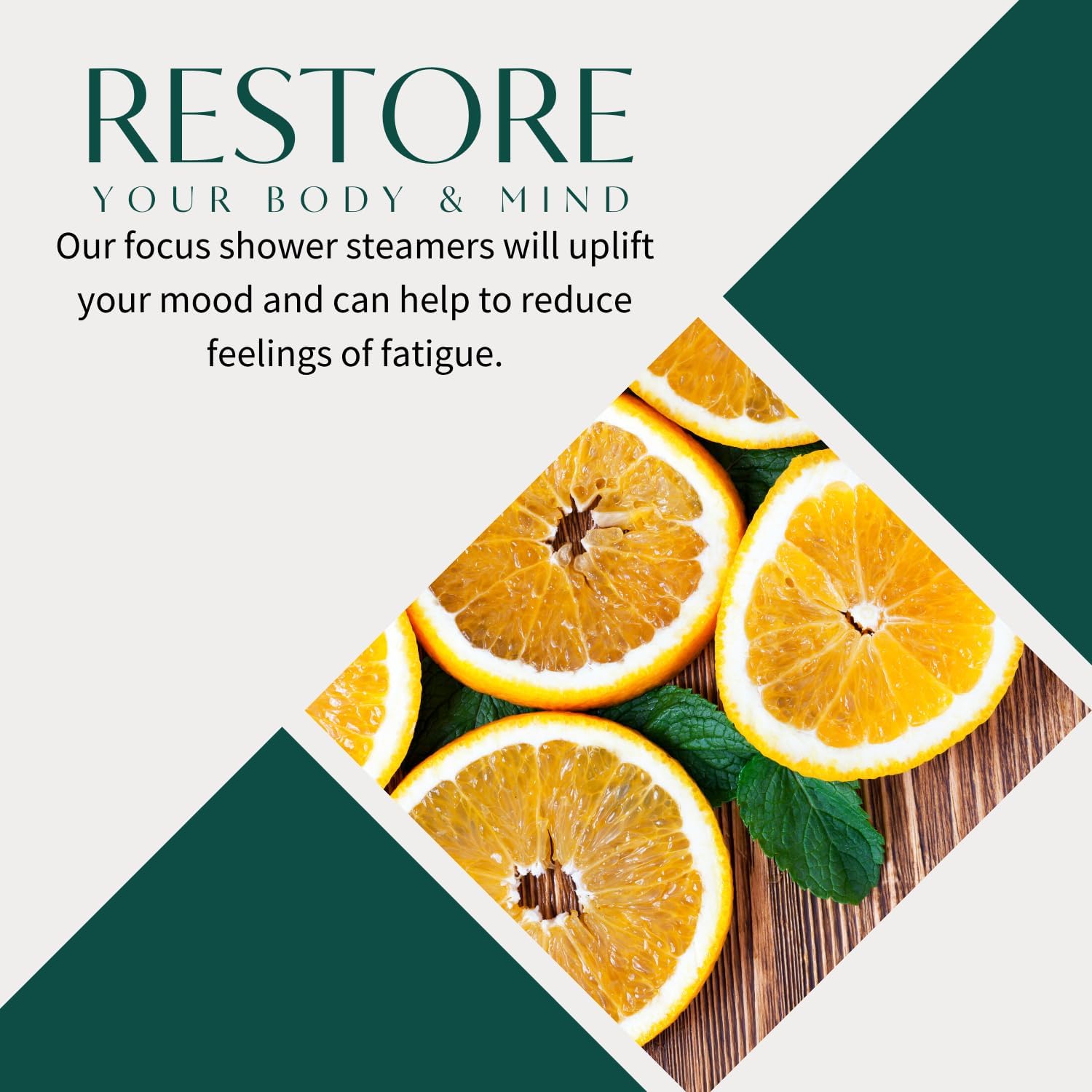 - RESTORE YOUR BODY & MIND: Invite focus into your bathroom with these refreshing aromatherapy shower steamers. Transform your shower into an aromatic spa experience. Enjoy the citrus, minty fresh scents of Orange and Peppermint essential oils. Our focus shower steamers are uplifting, perfect to give your mood a boost