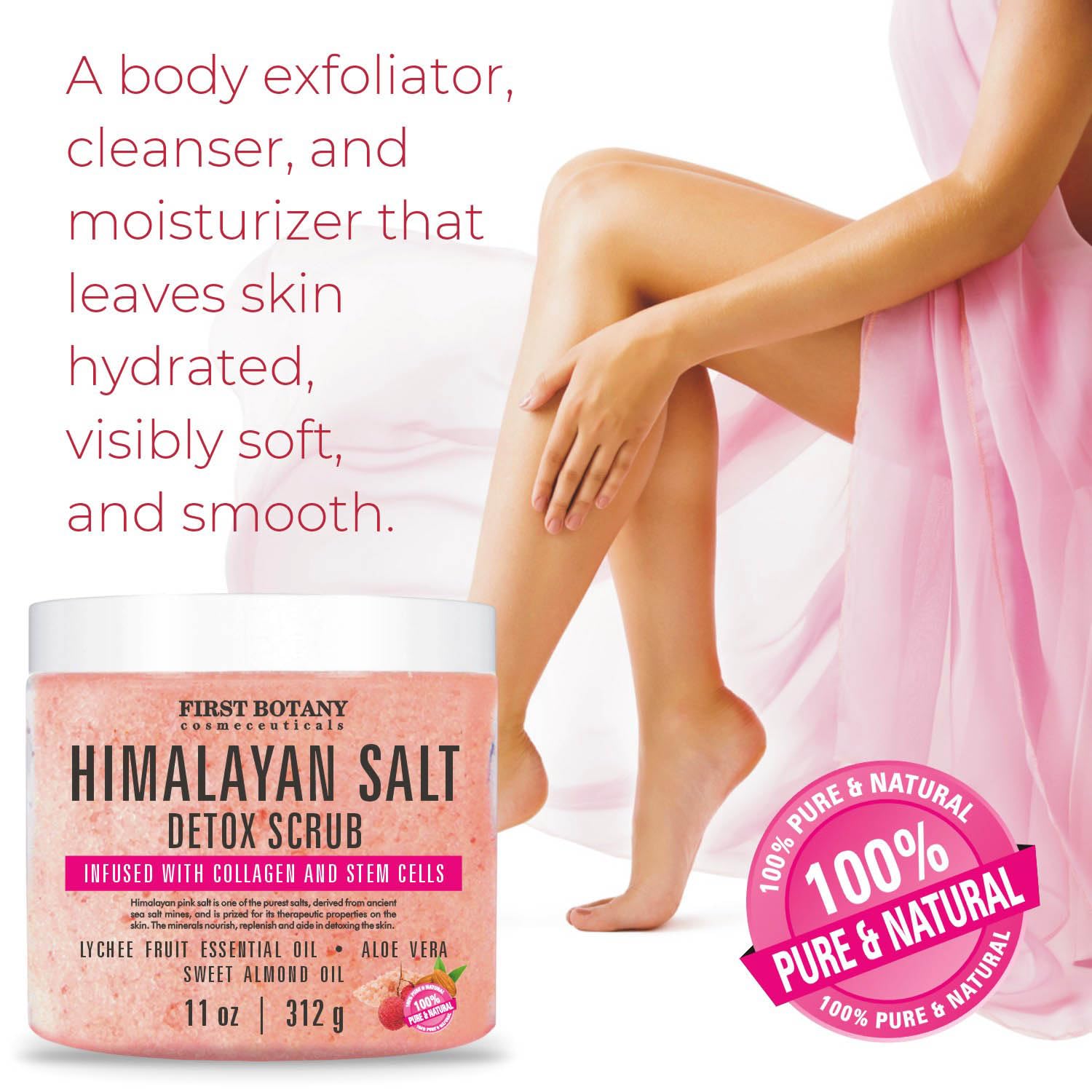 - THE BEST EXFOLIATING EXPERIENCE: First Botany Himalayan Salt Body Scrub / Facial Exfoliator serves as a body scrub, facial scrub, hand scrub or foot scrub! Himalayan Sweet Almond & Lychee Crystal Salt Body Wash /Scrub comes with a high quality Himalayan salt with its maximum nutrient profile including calcium, magnesium, potassium, copper & iron; no harmful chemicals.