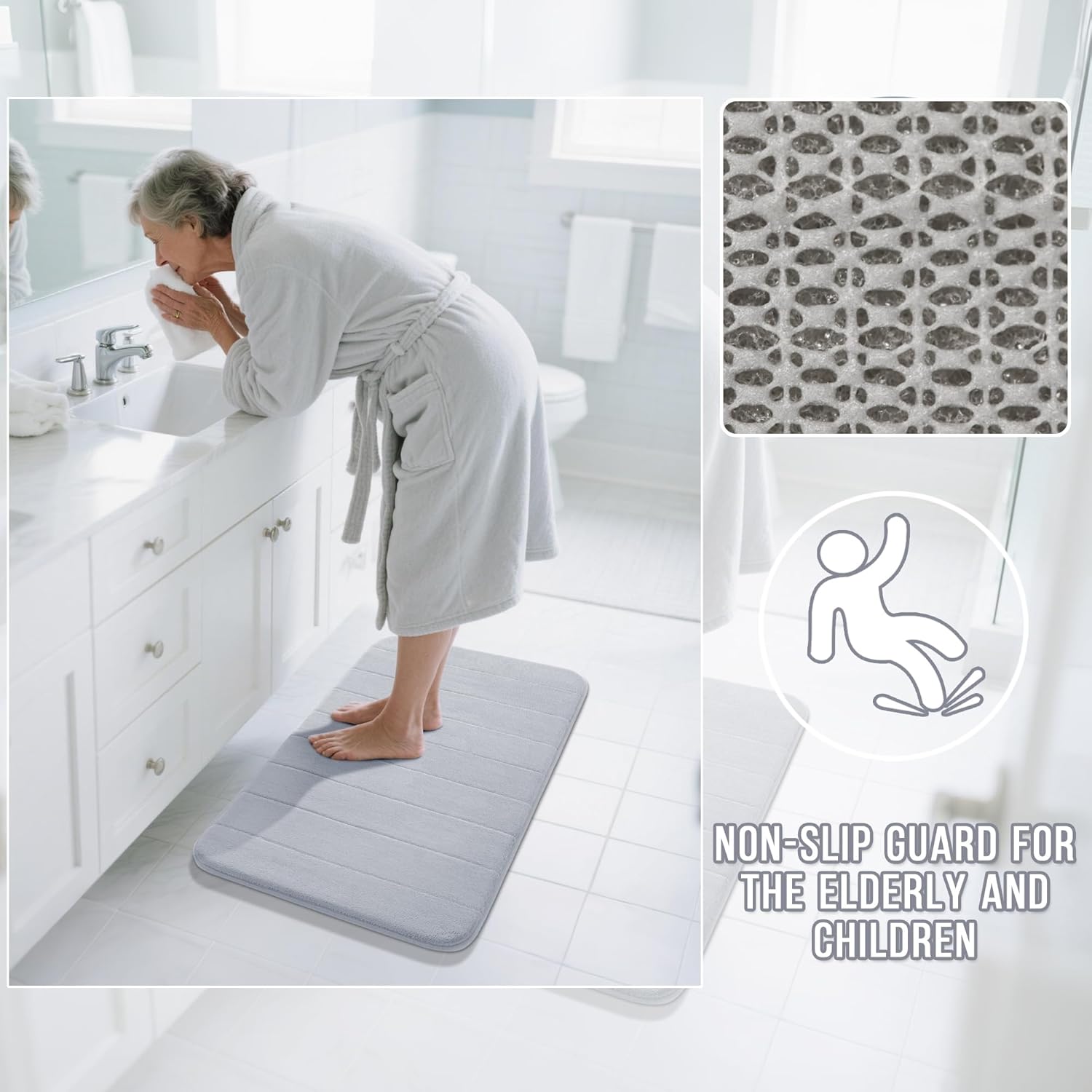 - 【Rapid Lock Absorption: Coral Velvet + Deep Foam Core】Yimobra bath mat engineered with premium coral velvet surface and deep memory foam core, our Rapid Lock technology instantly traps water. The coral velvet fibers actively pull in liquid while the high-density foam core prevents seep-through, ensuring maximum dryness after every use