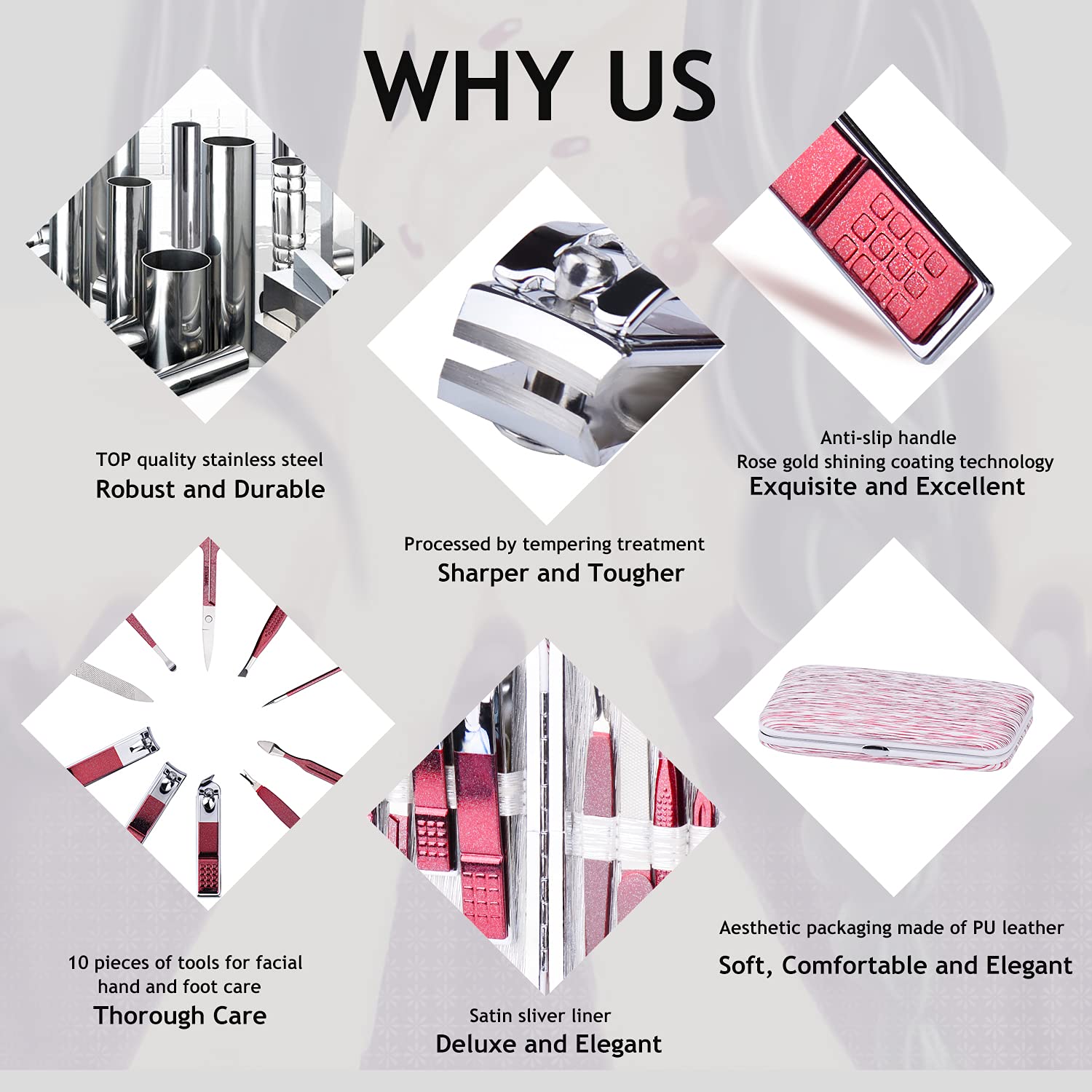 Manicure Set 10 in 1 Stainless Steel, Nail Clippers Scissors Pedicure Tools Kit - Portable Travel Grooming Kit for Men and Women with Leather Case (Rose Red)