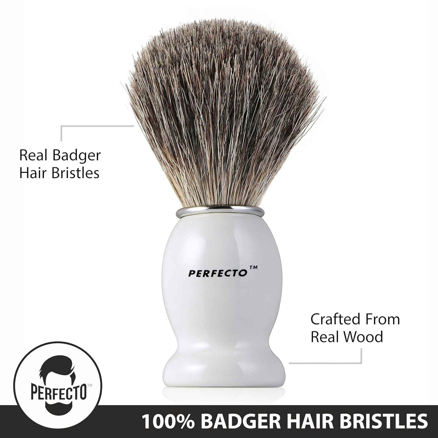 Perfecto 100% Pure Badger Shaving Brush-White Handle, Gift for Dad, Engineered for the Best Shave of Your Life. For Fathers Day Gift, Safety Razor, Double Edge Razor, Straight Razor, Shaving Razor