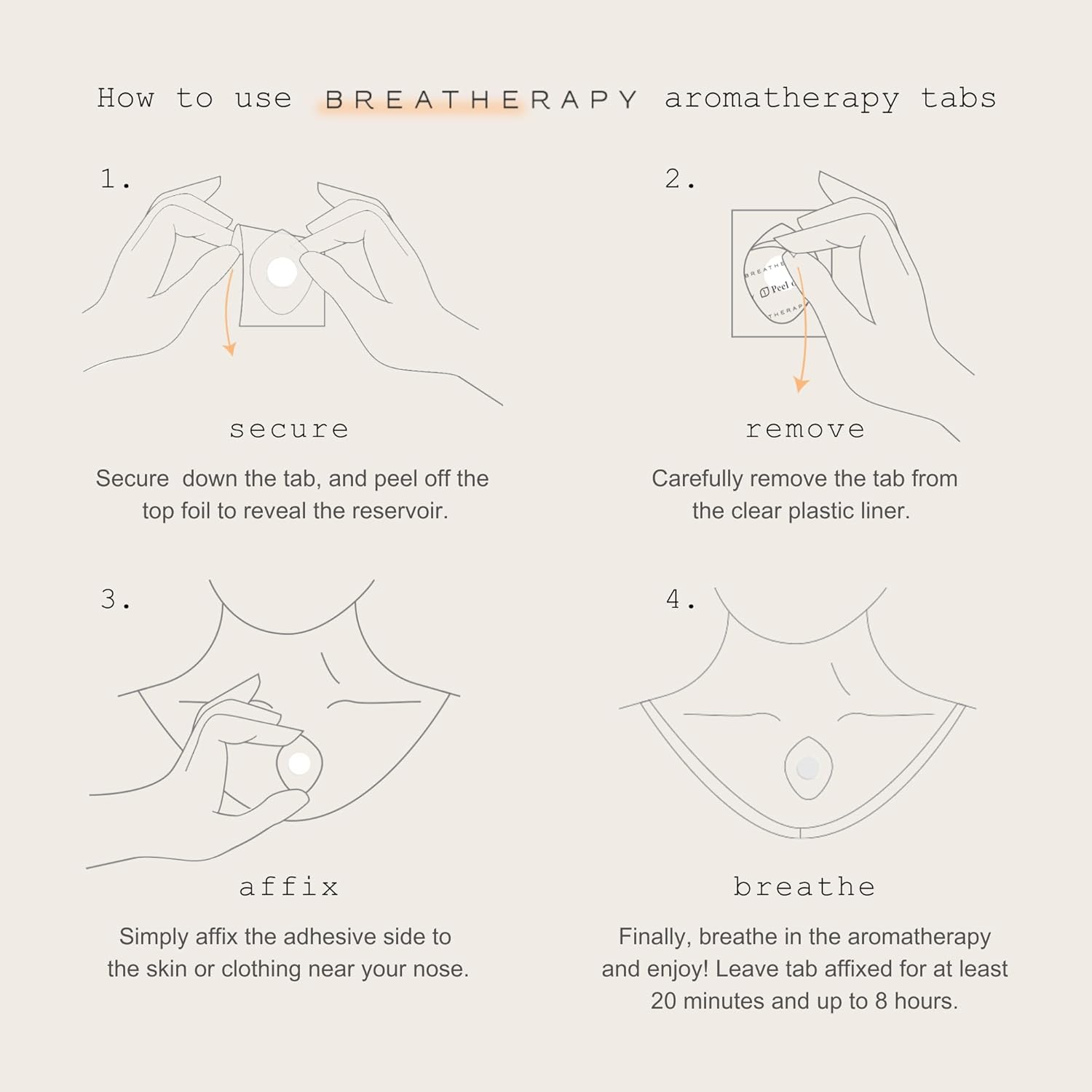 - Portable and discreet: Breatherapy patches work like a personal diffuser and can be worn on skin or clothing. Simply attach to your upper chest, wrist, neck or anywhere near enough to your nose to smell it. Wear 30 minutes up to 8 hours.