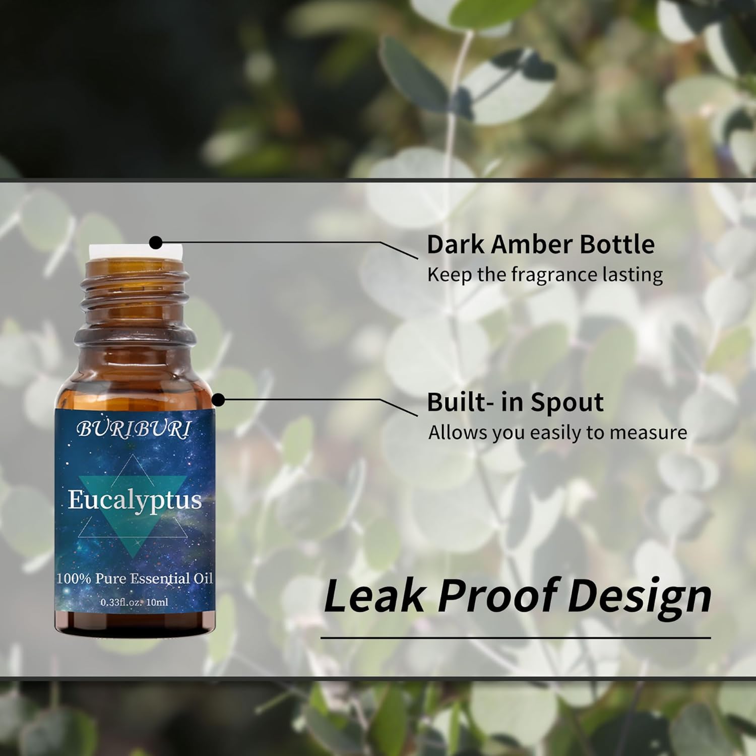 - Packing Includes: 10ml Lavender Oil Essential Oil (Lavandula angustifolia)x1, 10ml Eucalyptus Oil Essential Oil(Eucalyptus Globulus)x1. With no adulterants or dilution, 100% pure quality. BURIBURI scented oil is bottled in a durable amber glass bottle.