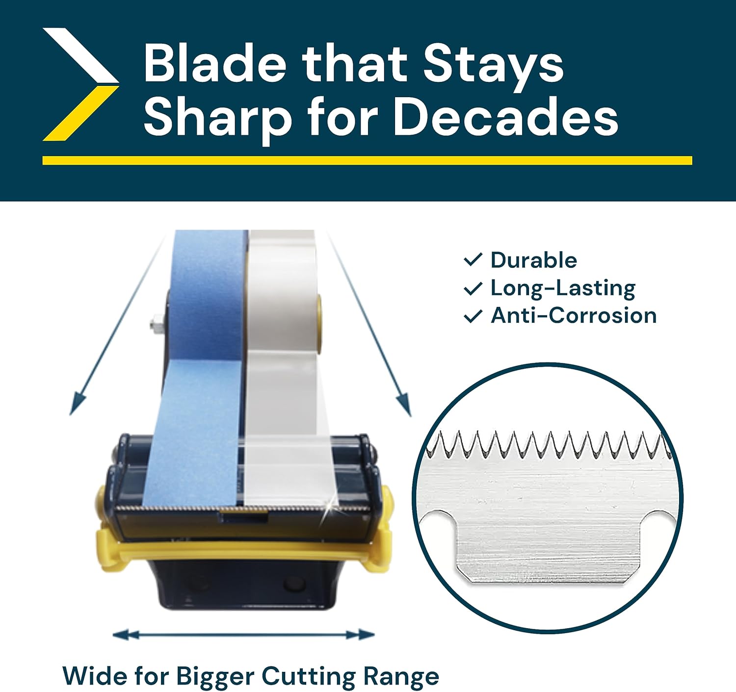 - ❰Cuts Better❱ The dispenser has a cutting angle range that provides greater flexibility. The wider blade reduces the time spent aligning tape ends, making your workflow more efficient. It is anti-rust, ensuring longevity and long-lasting sharpness.