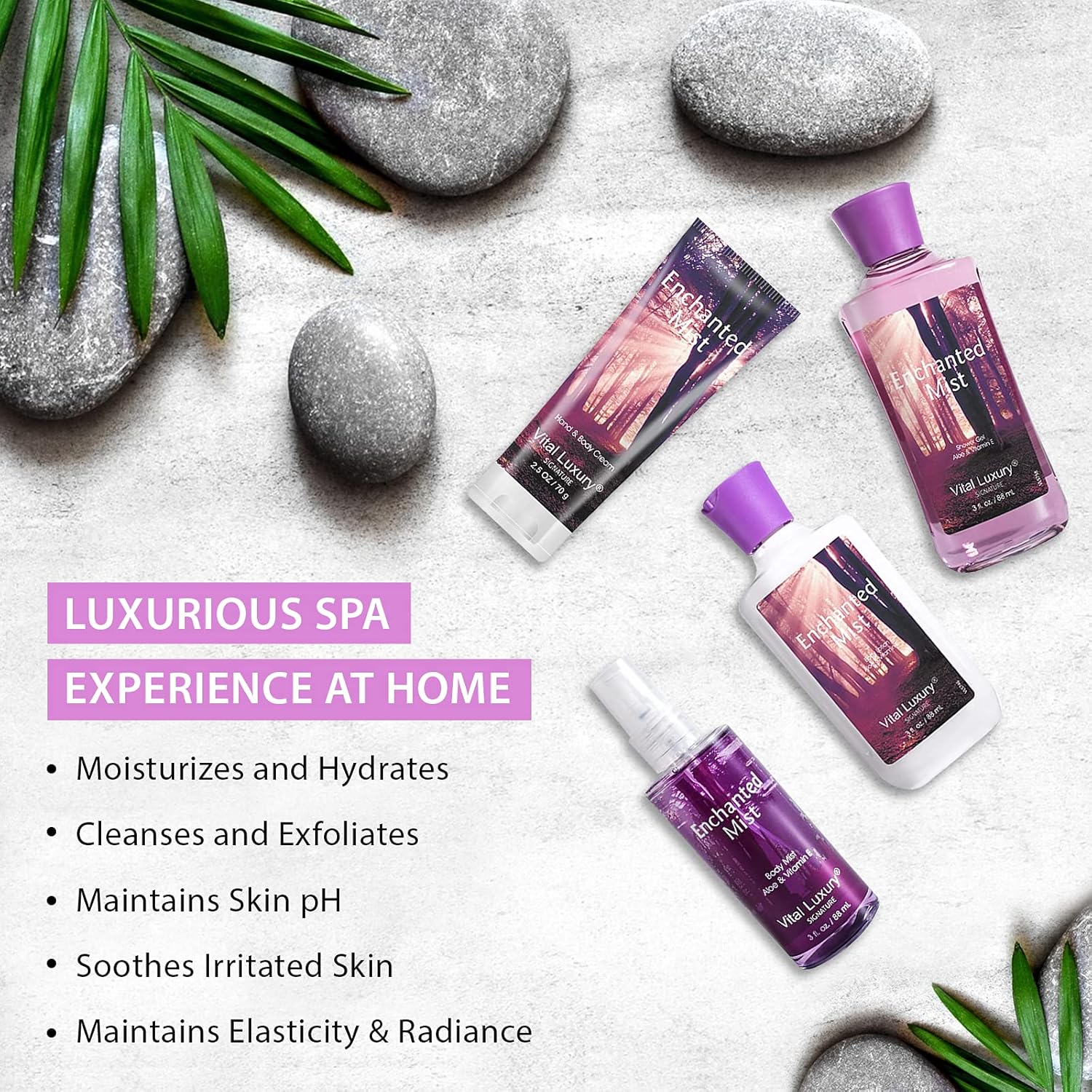 - ALL IN ONE BEAUTY KIT: Enjoy every day with exotic fragrance and moisturization with Vital Luxury home spa products. Our organic spa kit includes Body Lotion, Shower Gel, Body Cream, and Fragrance Mist, each with 3 Fl oz (88 ml). This will alleviate your mood and give you a relaxing spa feel at home