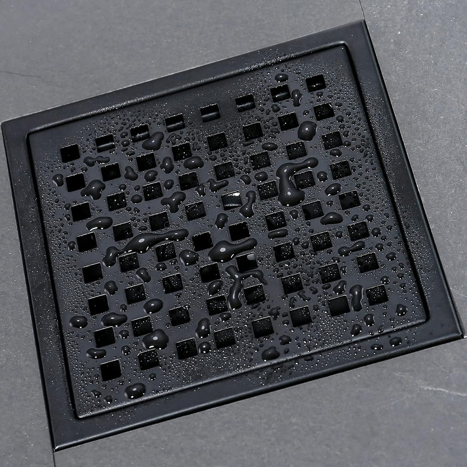 - ①【Square Design】:Our Square Black Shower Floor Drain 6 Inch Length, 6 Inch Width,2 inch High Flow Outlet.20-25 L/min high flow capability(NON-SCREW INTO DRAIN RISER TYPE). Fits US NO HUB Drain Base System. 2" PVC No-hub Shower Drain Base included.
