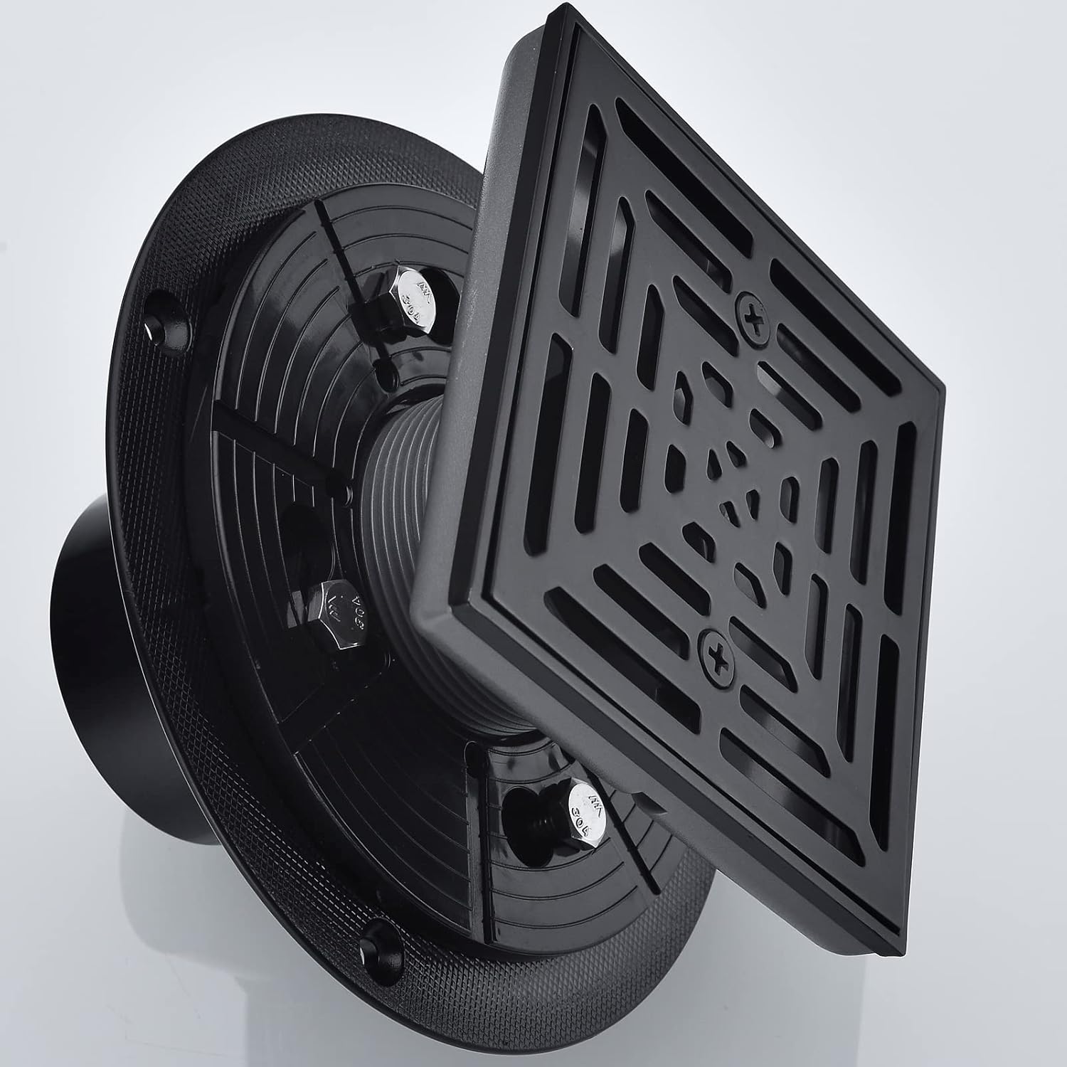 RANDOM 4 Inch Black Shower Drain Square with Adjustable PVC Base Flange,SUS304 Stainless Steel Matte Black Shower Floor Drain with Removable Cover Grid Grate