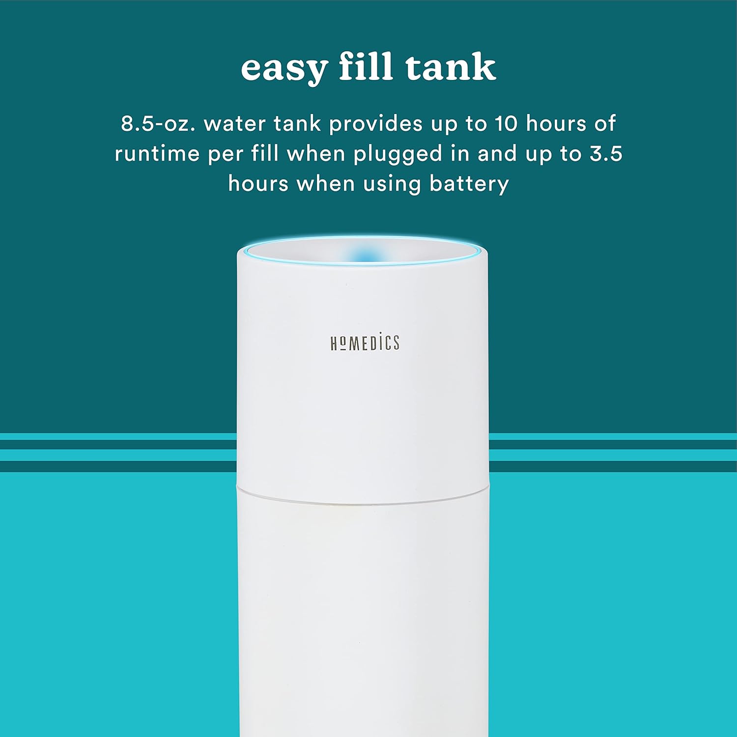 - TOP-FILL HUMIDIFIER – The 8.5-oz. water tank provides up to 10 hours of runtime per fill when plugged in and up to 3.5 hours when using battery with Clean Tank Technology