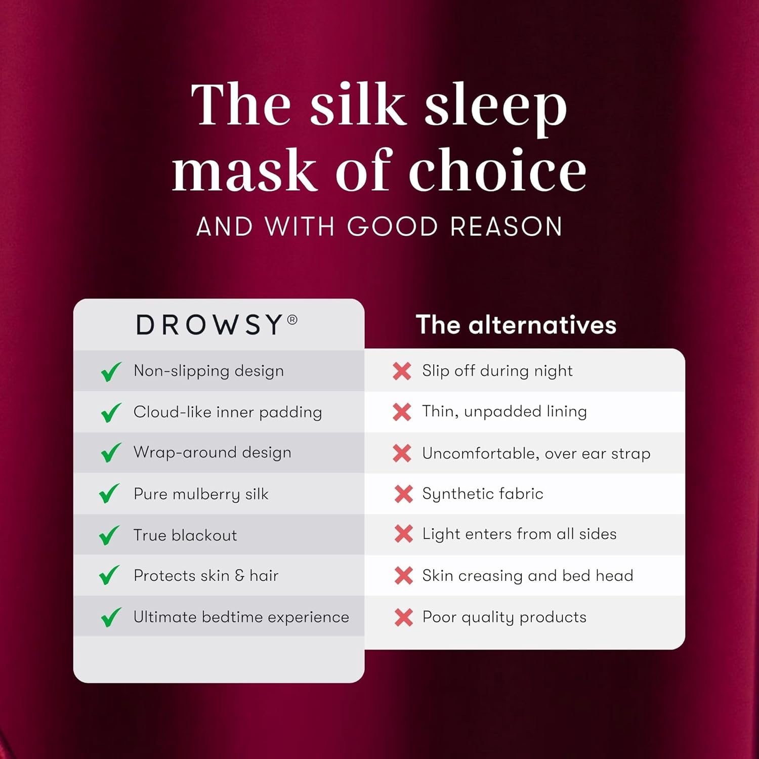 - ✔︎ WRAP-AROUND SKIN & HAIR PROTECTION - Keep your skin and hair protected from friction and damage. Help prevent creasing from pillows and bedsheets. Cushion the delicate skin around your eyes in pure mulberry silk. Enjoy the glorious sensation of Drowsy as you sleep.