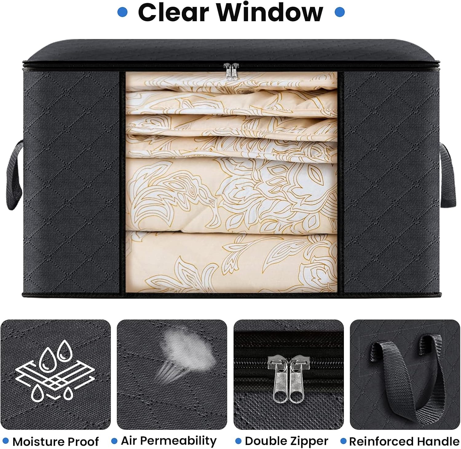 Fab totes 4 Pack Clothes Storage, Foldable Thick Fabric Blanket Storage Bags, Containers for Organizing Bedroom, Closet, Clothing, Comforter,Closet Organization with Handle,Black