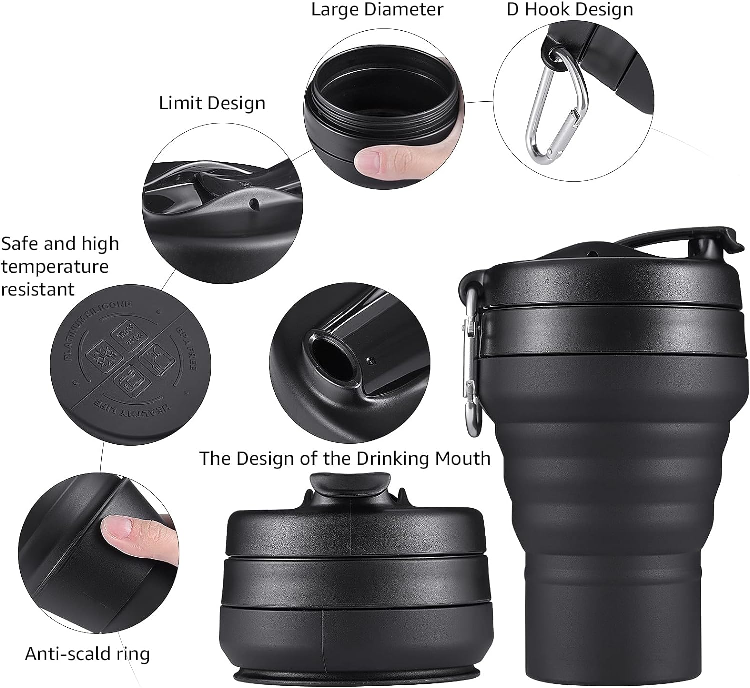 - [Safe Material Food Grade Silicone]- Our collapsible travel cup made of food grades silicone, No BPA. It added a anti-scald ring for safety. Besides. It is easy to clean, non-toxic, odorless, non-staining, durable, flexible & reusable, withstands temperature of -104â ~ 428â. Safe and healthy for the whole family. It`s safer and larger than similar products in the market.