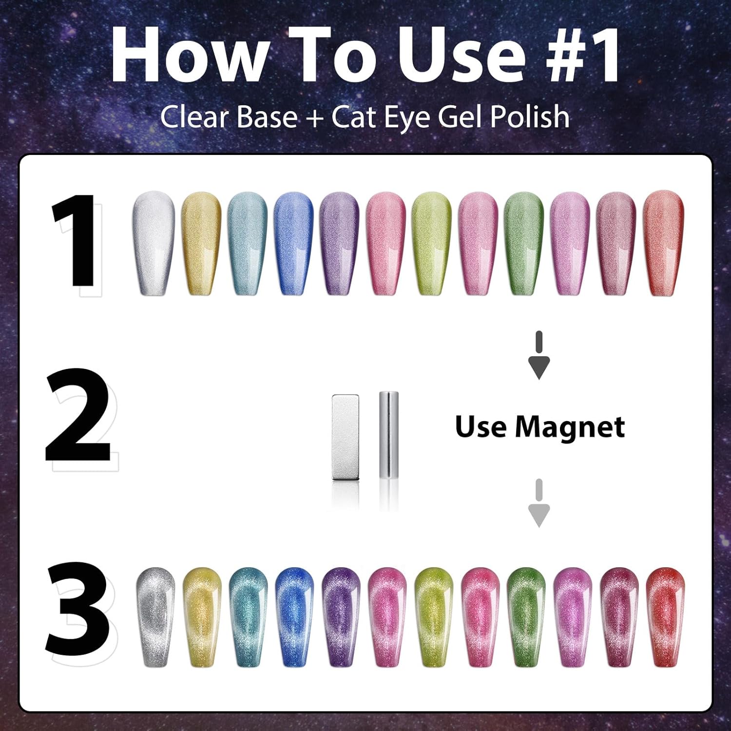 - ✨Holographic cat eye gel nail polish set is rejuvenated. Make galaxy effect, aurora effect, different colors from different angles. A beautiful cat eye gel polish for your nail art collection. Making galactic effect, auroras effect, black hole effect on your nails, different colors from different angles. A marvellous gel nail polish set to your nail art collection.