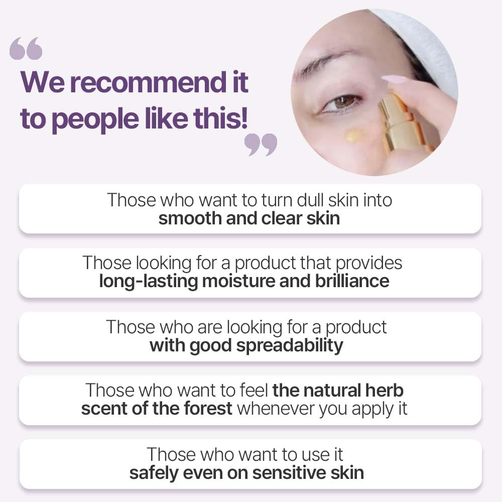 - [Another Benefits / Features] It makes the skin glowy right after applying it. Not only moisturizes the inside & outside but also keeps moisture with the Triple combination of Polymer, Medium and Small Molecules. Long persistence of moisture & brilliance, soft application. Turning dull skin into smooth and clear skin. * Natural Herb Scent, Natural Color of Plant extracts (No ! artificial scent & color) â Good for Healing!