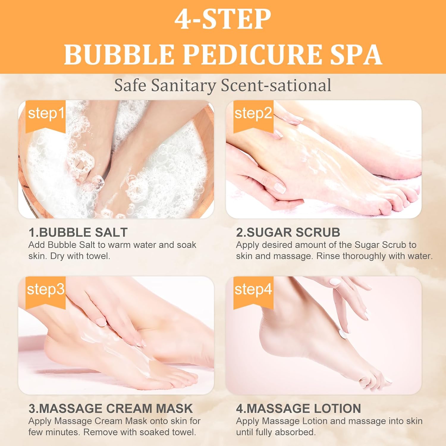 Pedicure Kit Foot Soak Set: Bubble Salt, Sugar Scrub, Massage Mask, Massage Lotion in a Box, 4 Step Foot Spa Kit for Dry Feet,Tired Feet(3 Set Tropical Fruit)