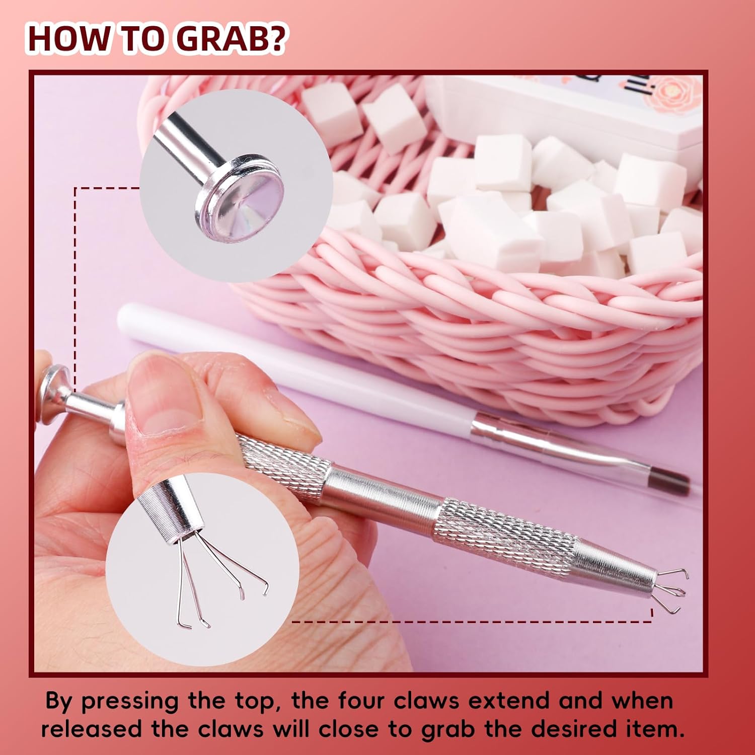 - Funtional Metal Grabber: Tired of fumbling with sponges and smudging your hard work? Our ingenious grabber pen is here to save the day! Simply press the top, and the retractable claws extend to firmly grasp the sponge. No more dropped sponges, just smooth, controlled application every time. Plus, use it to precisely place rhinestones and other nail art charms!