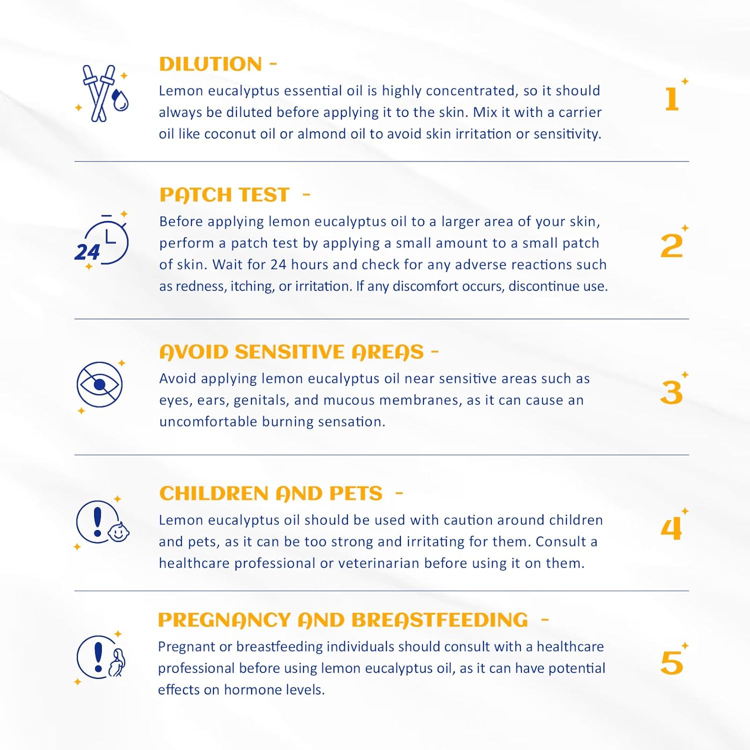 - Body Massage: Mix 2-3 drops of lemon eucalyptus oil per 20 ml of carrier oil (e.g. Sweet Almond oil or Jojoba oil). Take an appropriate amount of the product into your palm and apply to the desired area of the body in a circular motion