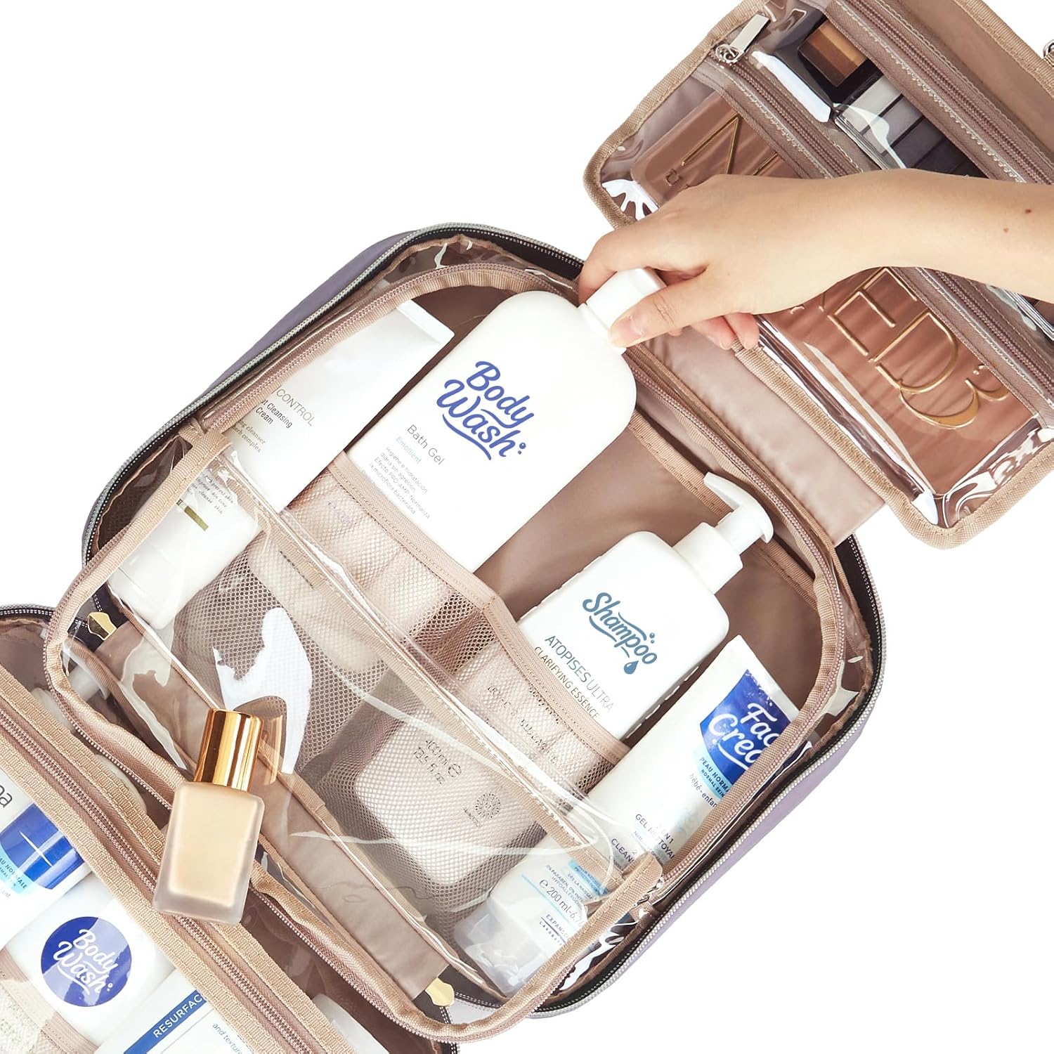 NISHEL Travel Toiletry Bag for women, Portable Hanging Organizer for Full-Sized Shampoo, Conditioner, Brushes Set, Makeup Accessories, Large Size, Purple
