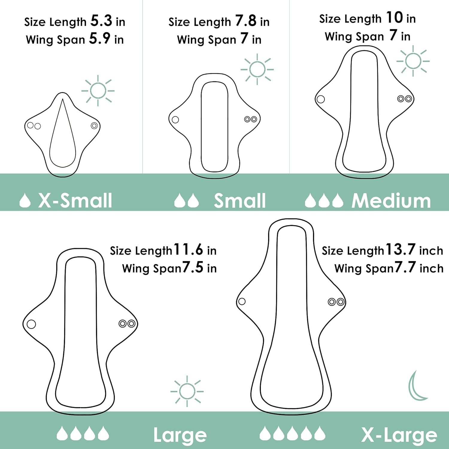 - 6pcs Cloth Pads in 5 Sizes: Each set cloth menstrual pads including 6 pack cloth panty liners. Wegreeco feminine Pads for Women are available in 5 sizes. Extra Small size length 5.3 in, wing span 5.9 in, Small size length 7.8 in, wing span 7 in, Middle size length 10 in, wing span 7 in, Large size length 11.6 in, wing span 7.5 in, Extra Large size length 13.7 in, wing span 7.7 inch.
