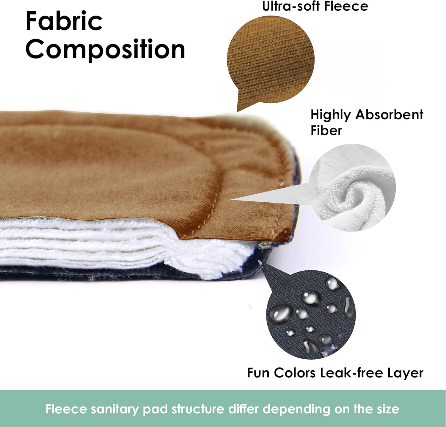 - Breathable Layer: Cloth panty liners structure differ depending on the size. Menstrual cloth pads Inner layer is ultra-soft fleece which lays against your skin, moistures wicking, and neutralizes odor. Lining layer is super-absorbent, and different sizes the layers are different. Outshell layer is leak-free TPU with backside silicon dot. The soft and gentle reusable sanitary pads offer great coverage and absorbency to keep you from leaks and spills.