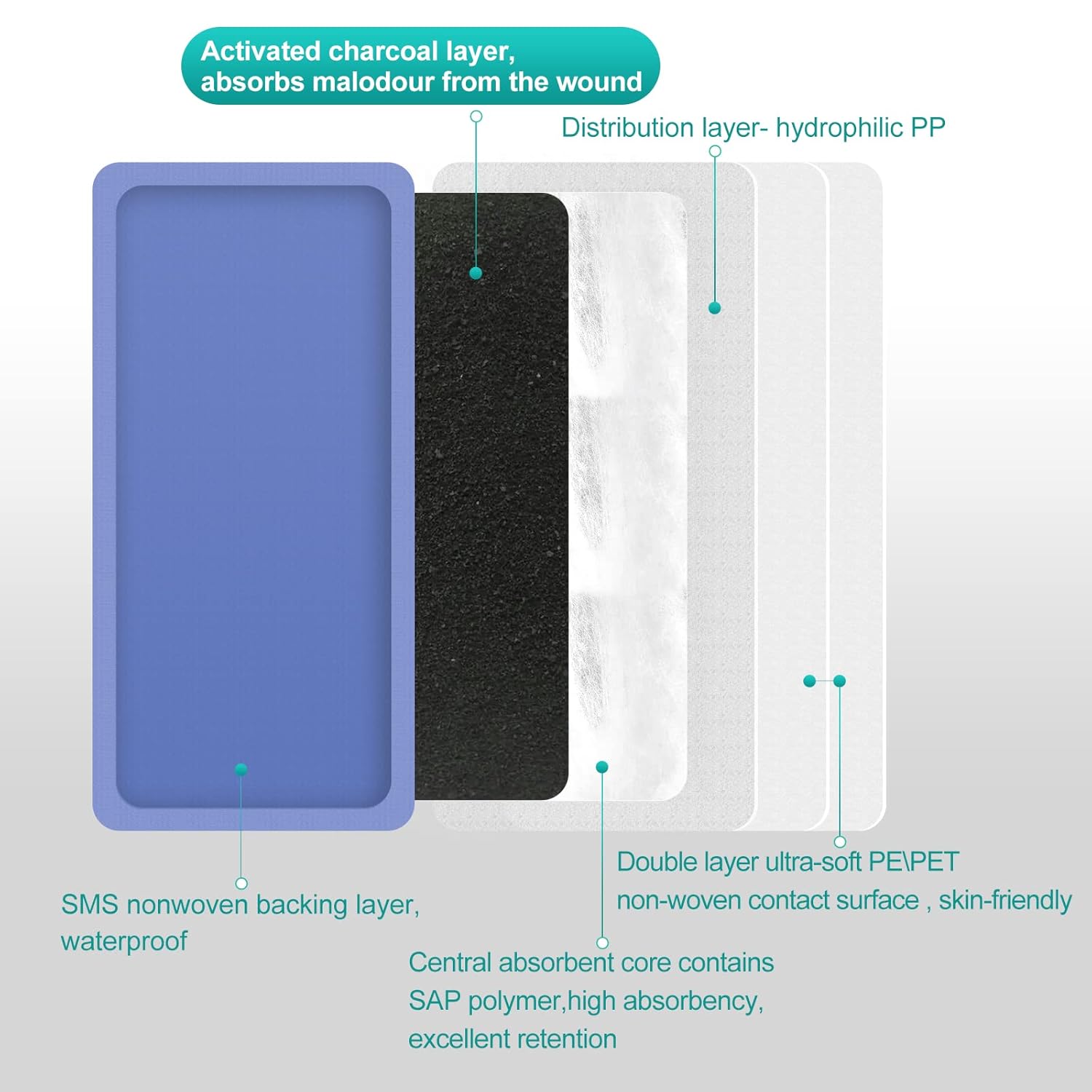 - ORDOR ADSORPTION - The activated charcoal layer absorbs malodour molecule from the wound, improve wound care experience and avoid odor embarrassment.