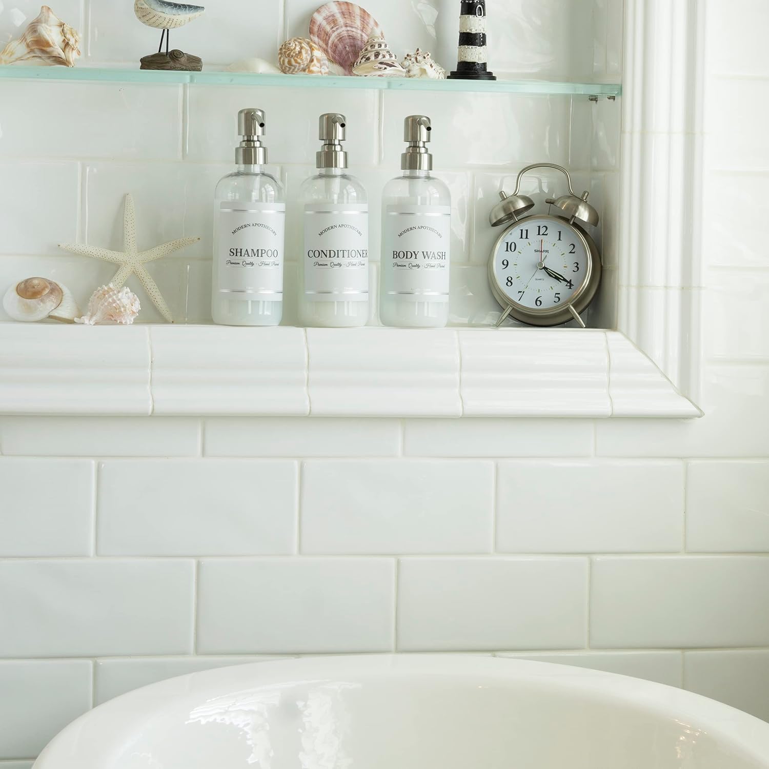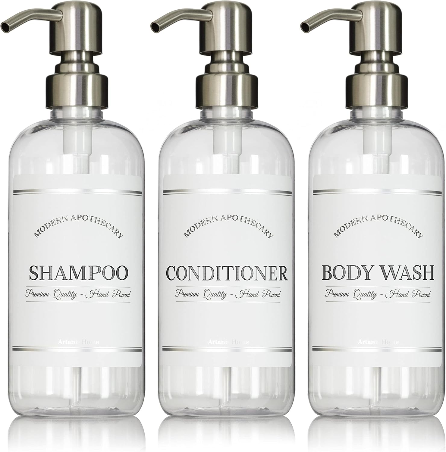 - Bring Style To Your Bathroom: Revel in the luxury of a well-organized shower. Refine your interior decor with these chic body wash, conditioner and shampoo dispenser bottles. Curate your whole home. Modern Apothecary bathroom bottles coordinate with additional matching titles for the sink, kitchen, office, and rentals. Classy, with a touch of retro flair
