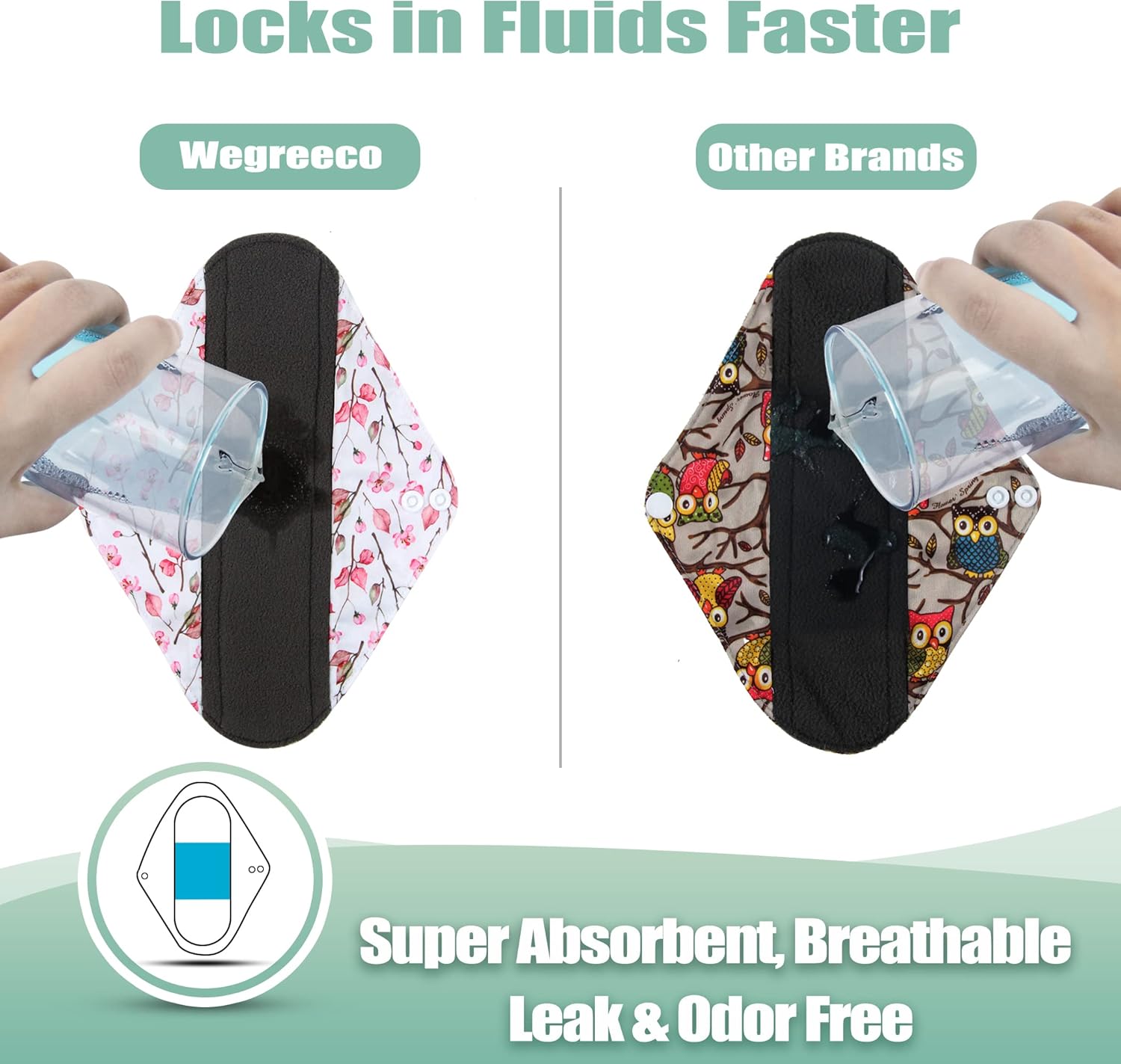 wegreeco Charcoal Reusable Menstrual Pads - Reusable Sanitary Pads | Reusable Panty Liners | Soft Cloth Menstrual Pads - 6 Pack with 1 Cloth Mini Wet Bag (M, Cherry Blossoms)