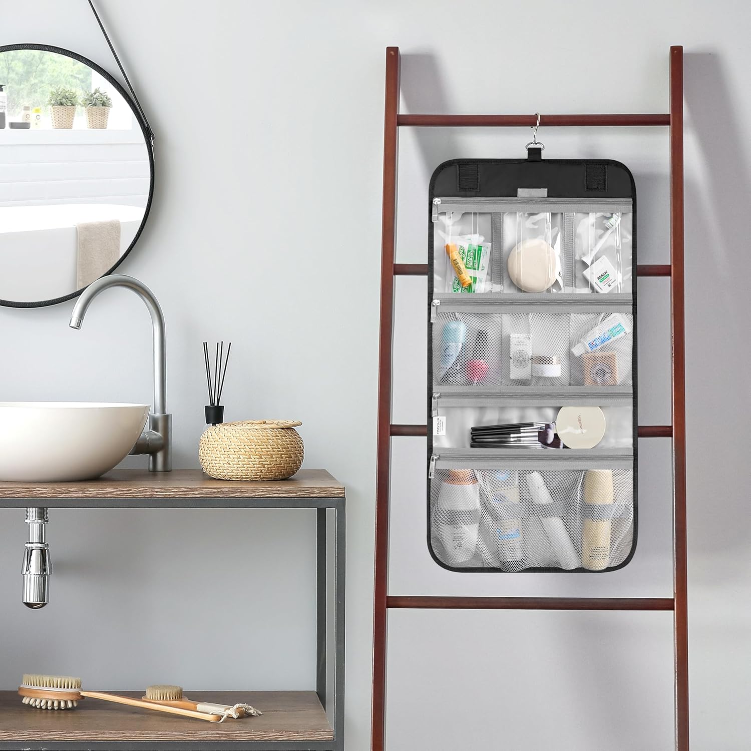 - WATER-RESISTANT & EASY TO CLEAN: Durable polyester with waterproof sections, just wipe clean. Perfect for storing travel-size shampoo, conditioner, face wash, toothbrushes, and even a full-size hairbrush. Keeps everything dry, tidy, and ready for any trip.