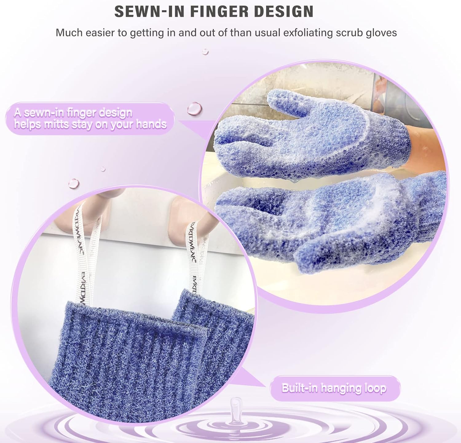 - Sewn-in Finger Design: Our added stitching design helps eliminate the problem that people have with mitts slipping off in the shower or bath. And when you are done, simply rinse in the shower after use and hang to dry with our built-in hanger loop