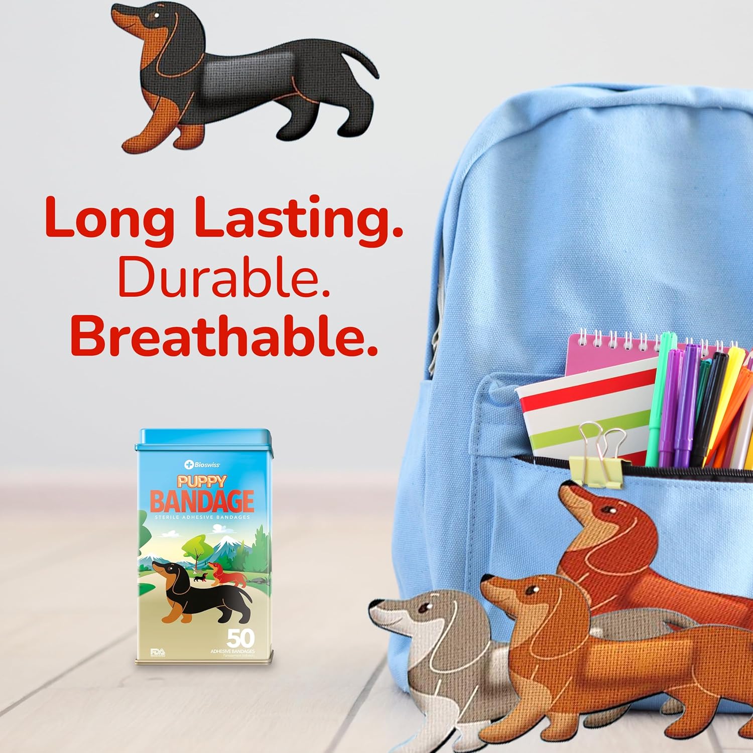 - 50 PUPPY DOG KIDS BANDAGES: Fun dog-shaped adhesive bandages tin helps protect cuts, scrapes, and minor wounds while making healing less stressful for children; bandages come in 4 assorted styles