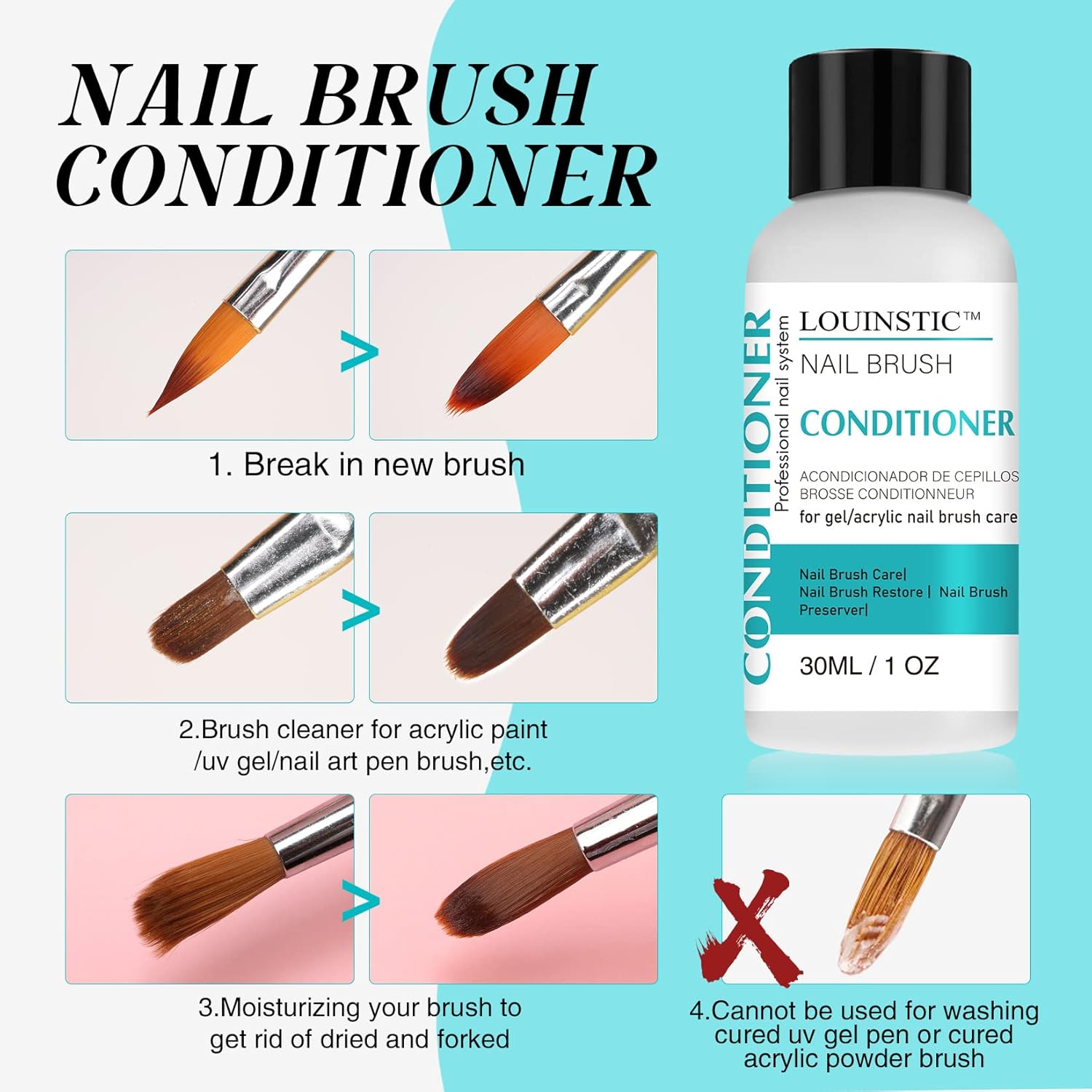- NAIL BRUSH CLEANER and CONDITIONER: LOUINSTIC brand new brush conditioner is suitable for breaking in a new brush, cleaning and conditioning acrylic paint / uv gel/nail art pen/poly gel nail brushes/ kolinsky acrylic nail brushes. It will keeps brushes longer beautiful and extends the life of your brushes significantly.
