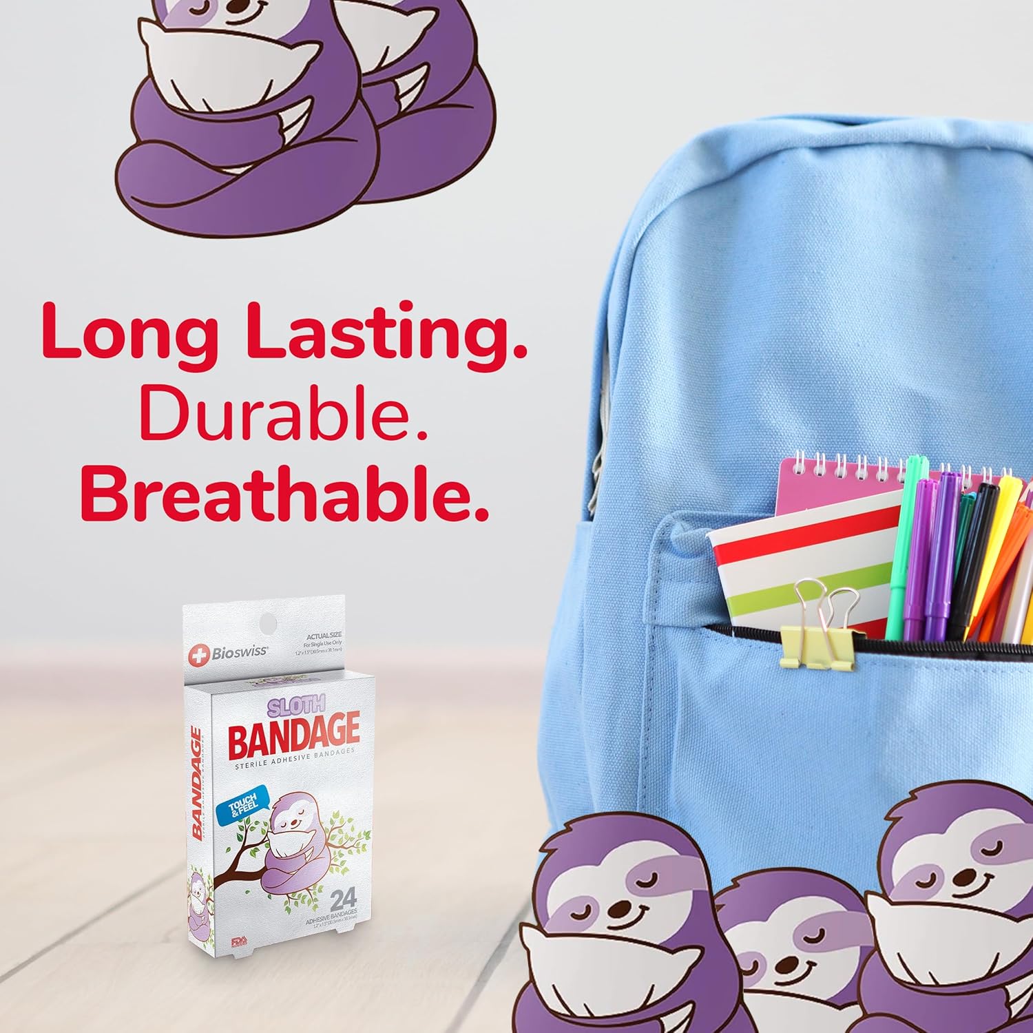 BioSwiss Kids Bandages, Sloth Shaped Self Adhesive Bandage Set, Latex Free, Sterile Wound Care, 24 Count