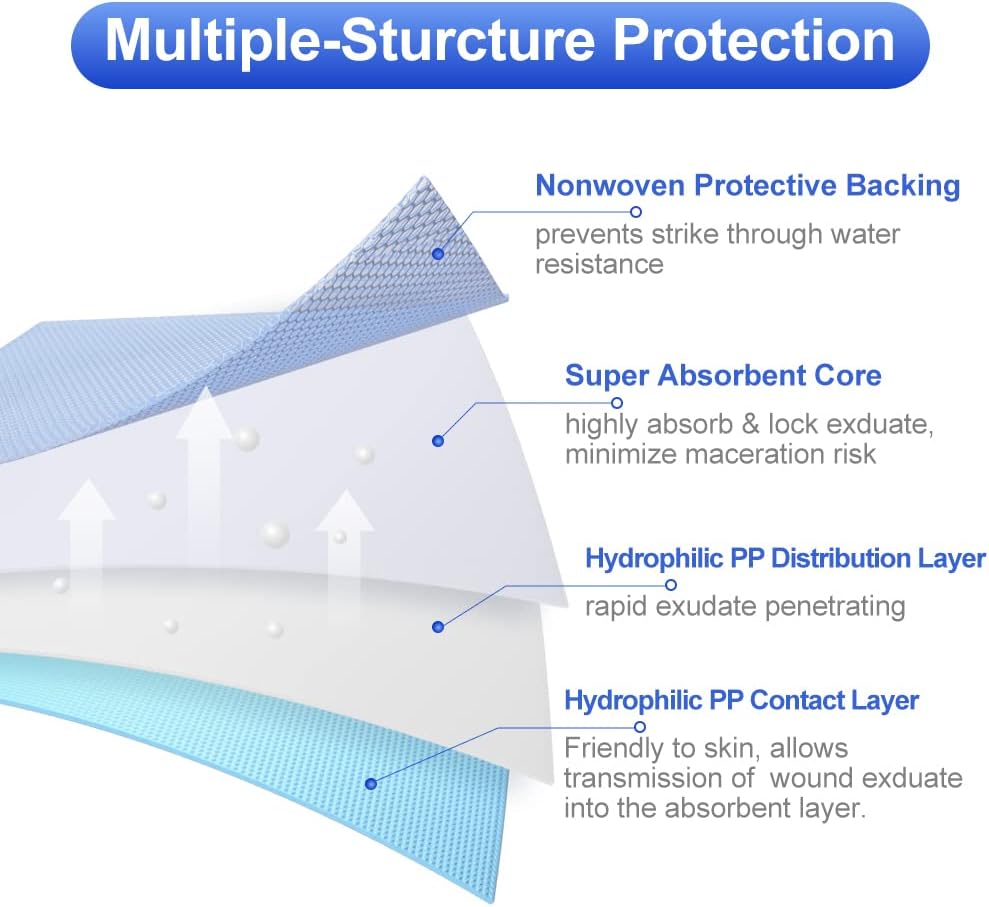 - IDEAL FOR LARGER WOUNDS – The 5" x 5" ultra‑absorbent bandages are designed for moderate to heavily exuding wounds, including pressure ulcers, leg ulcers, diabetic foot ulcers, bedsores, post-surgical incisions, and traumatic wounds. (Not recommended for dry or scabbed wounds.)