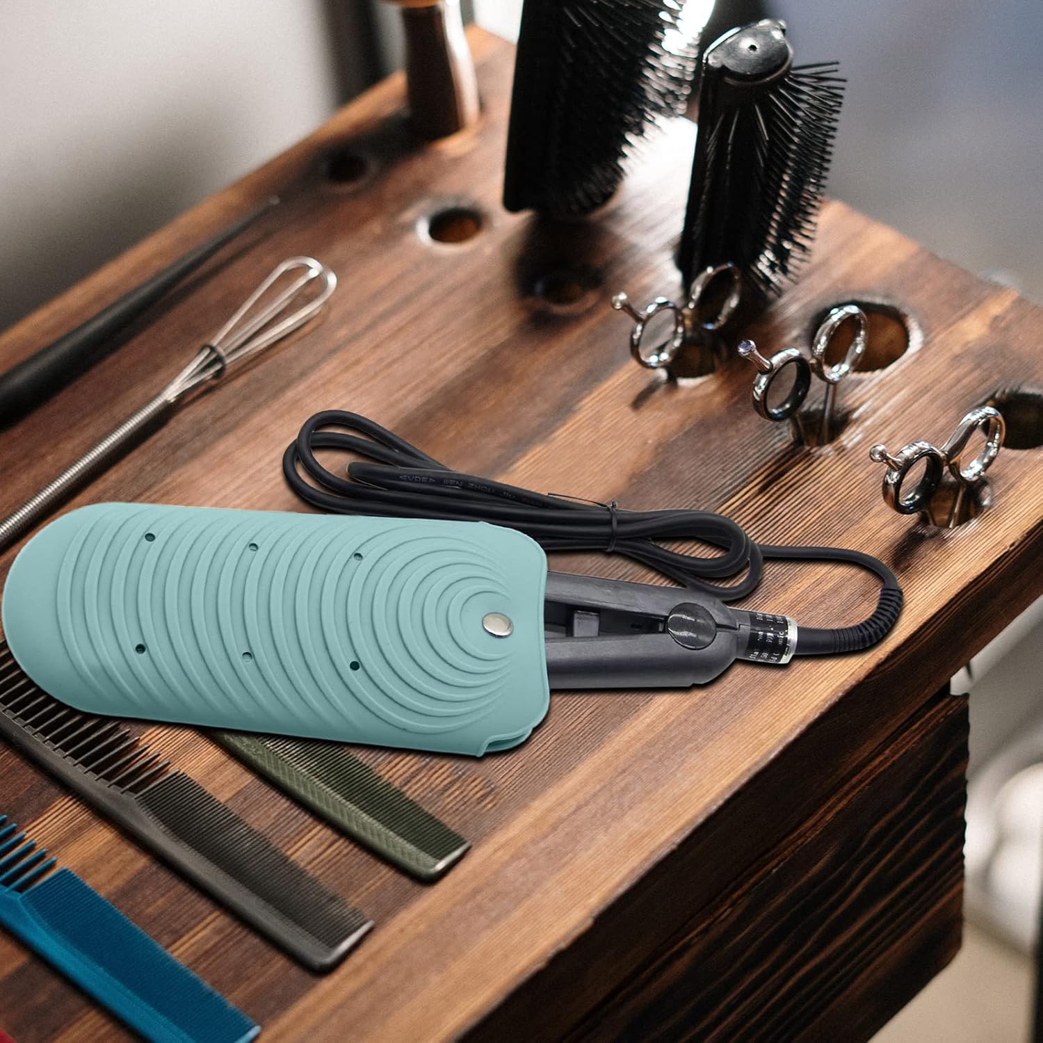 - 【Unique Design】Excellent non-slip waves texture effectively prevents hot hair styling tools slippery from table. Holes on mat pouch fast chill salon appliances. Front button fixes the tools unmovable.