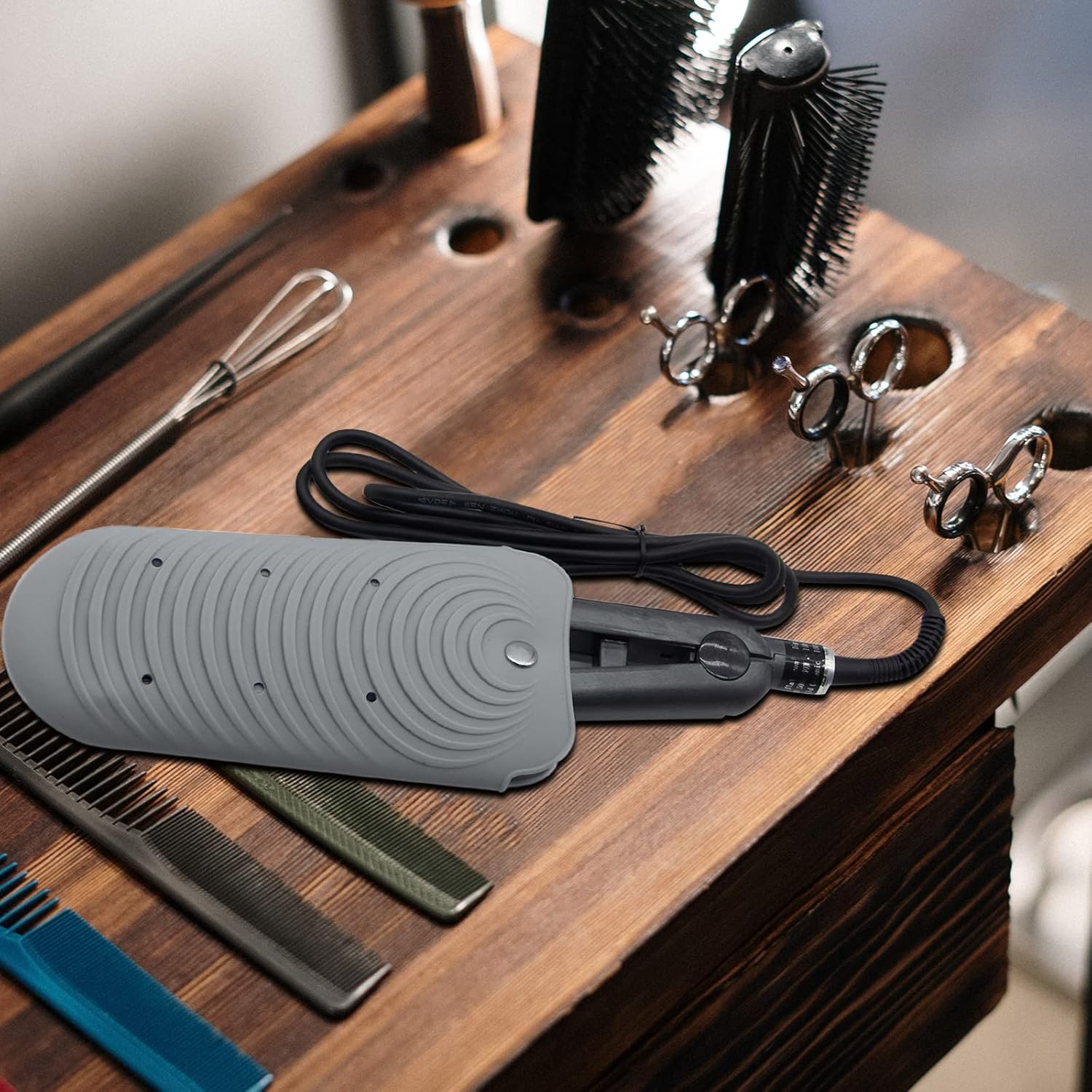 - 【Unique Design】Excellent non-slip waves texture effectively prevents hot hair styling tools slippery from table. Holes on mat pouch fast chill salon appliances. Front button fixes the tools unmovable.