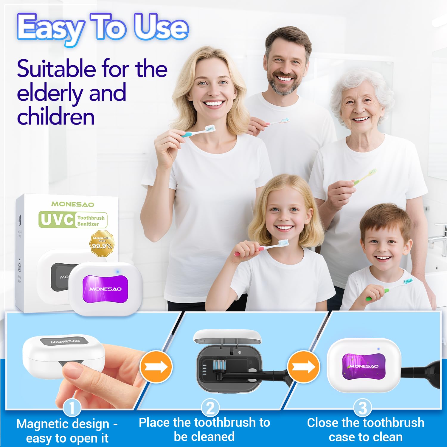 - Rechargeable, Long Lasting Life: MONESAO travel home toothbrush case for quick charging for your daily use.Fast charging in about 2 hours and on a full charge it can be used for 30 days on a single charge.No need to worry about running out of power even when traveling for business, the travel toothbrush cover is portable and easy to use,simple, friendly and effective. You will no longer smell the on your toothbrush