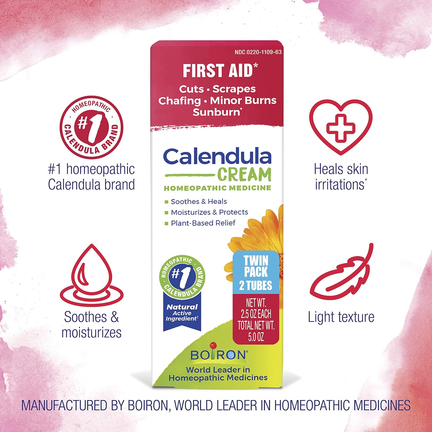 - [PLANT-POWERED FIRST AID RELIEF OF SKIN IRRITATIONS, CHAFING, SUNBURN]: The flowers of the Calendula officinalis plant, also known as the Garden marigold, have been used topically for generations to naturally heal skin irritations; powered by calendula plant actives, Boiron Calendula Cream temporarily protects and helps promote healing of cuts, scrapes, chafing, minor burns and sunburns; this water-based formula is free of parabens, dyes and fragrances; from Boiron, the number one selling homeopathic calendula brand and world leader in homeopathic medicines